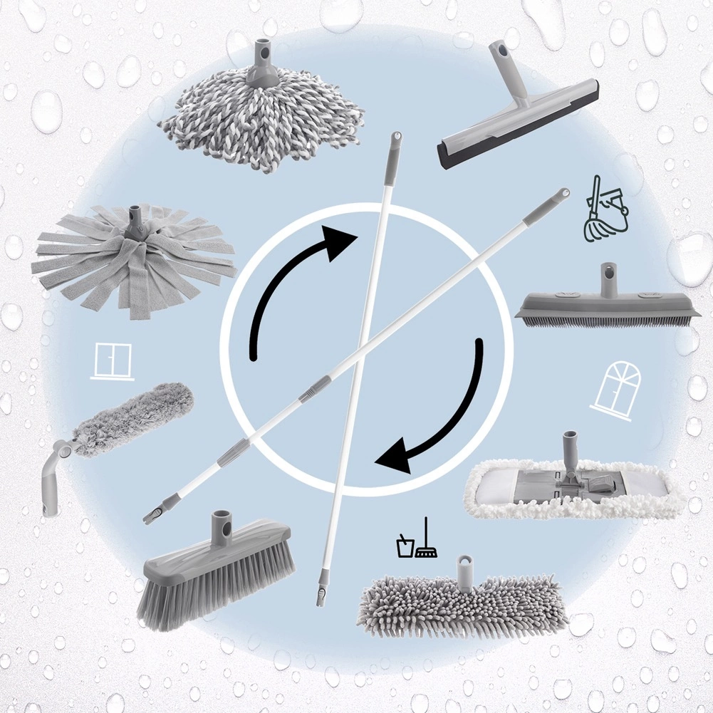 Díky materiálu odolnému vůči vlhkosti se smeták snadno udržuje – stačí jej opláchnout vodou. Hlavice je součástí systému vyměnitelných nástavců a nabídne rychlé nacvaknutí na kompatibilní tyče, takže máte vždy po ruce správný nástroj pro různé povrchy.