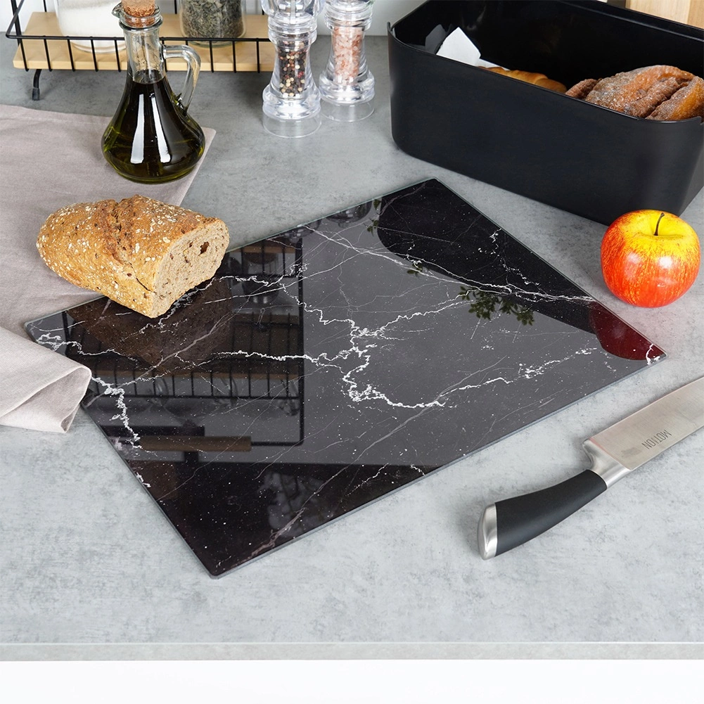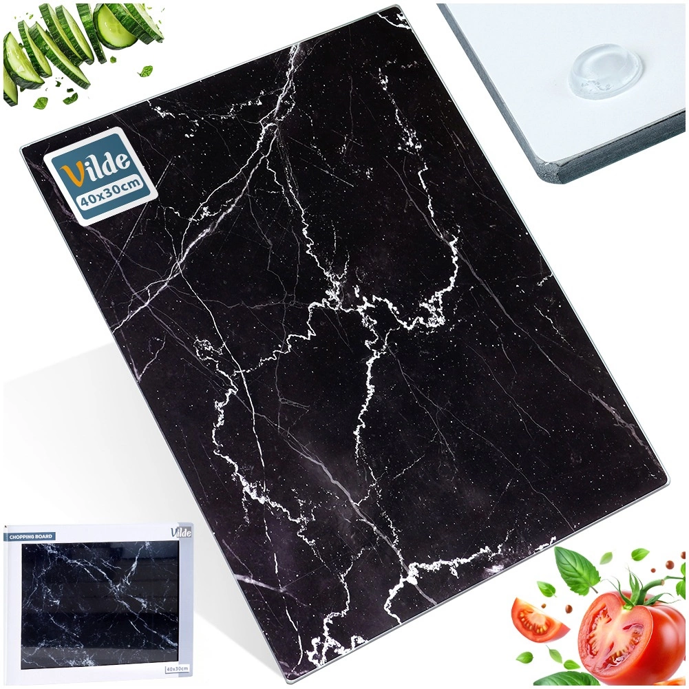 Elegantní skleněné prkénko s motivem černého mramoru o rozměrech 40 × 30 cm je ideální pro každodenní krájení i servírování. Je vyrobené z tvrzeného skla, má antiskluzové podložky pro stabilitu, je hygienické, snadno se čistí a zároveň ochrání kuchyňskou desku před poškozením. Stylový doplněk do každé moderní kuchyně.