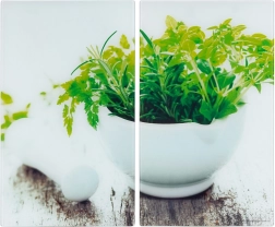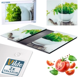 Praktická dvoudílná sada ze zdravotně nezávadného tvrzeného skla rozšíří vaši pracovní plochu a současně ochrání varnou desku před poškozením. Každá deska má rozměr 52 × 30 × 0,4 cm, dohromady vytvoří pracovní prostor cca 60 × 52 cm. Lesklý povrch s motivem čerstvých bylinek dodá kuchyni styl a je nepórézní – nepohlcuje pachy ani tekutiny.