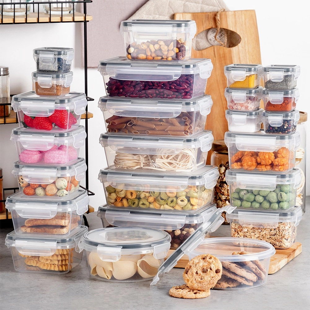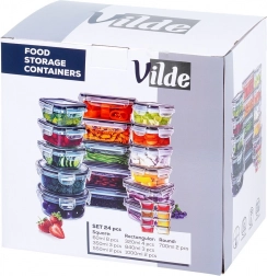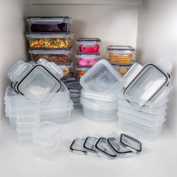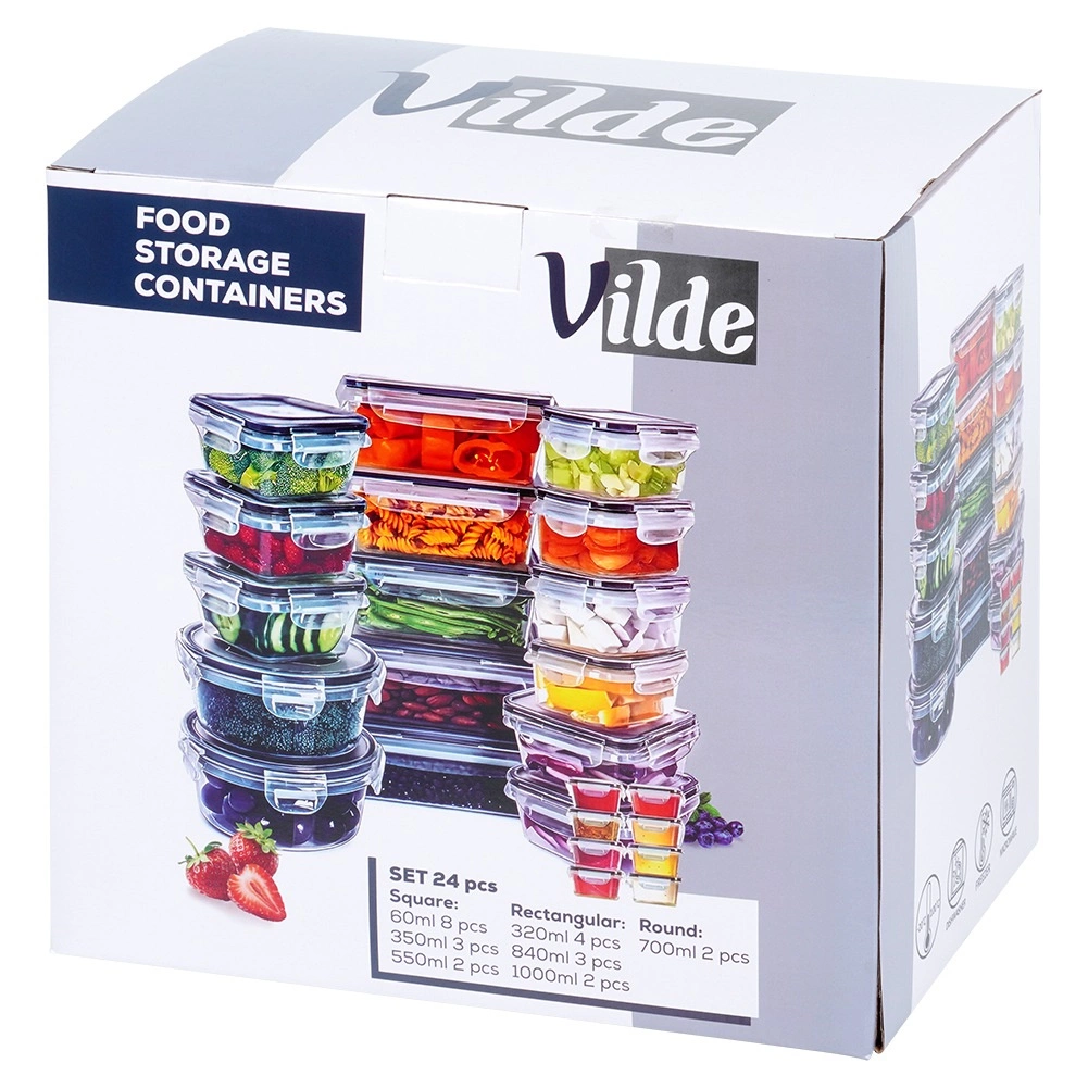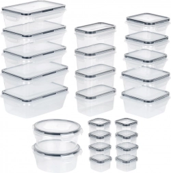 Praktická sada 24 průhledných dóz na potraviny v různých velikostech pro přehledné uložení sypkých surovin, jídel i snacků. Víčka se čtyřmi západkami a černým těsněním zaručují vzduchotěsné uzavření, delší čerstvost potravin a bezpečné přenášení. Dózy jsou vhodné do mikrovlnky (bez víčka), mrazáku i myčky.