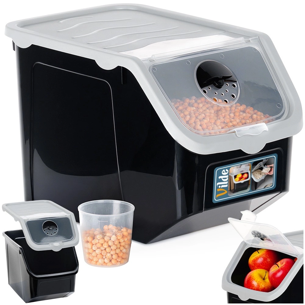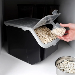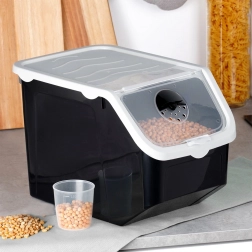 Box je z kvalitního plastu v černé barvě se šedým víkem, je vhodný pro kontakt s potravinami, snáší teploty od -20 °C do 100 °C, můžete jej dát do mrazáku i myčky nádobí. Skvěle poslouží i na luštěniny, rýži, těstoviny, krmivo pro mazlíčky či prací prostředky. Součástí je praktická odměrka pro přesné dávkování.