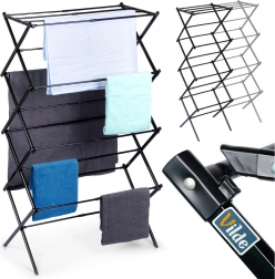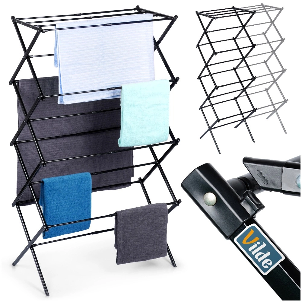 Praktický vertikální sušák na prádlo VILDE je ideální volbou do menších bytů i rodinných domů. Díky teleskopické šířce 43–75 cm snadno přizpůsobíte velikost prostoru i množství prádla. Robustní kovová konstrukce s černým práškovým lakem zaručuje dlouhou životnost a moderní vzhled.