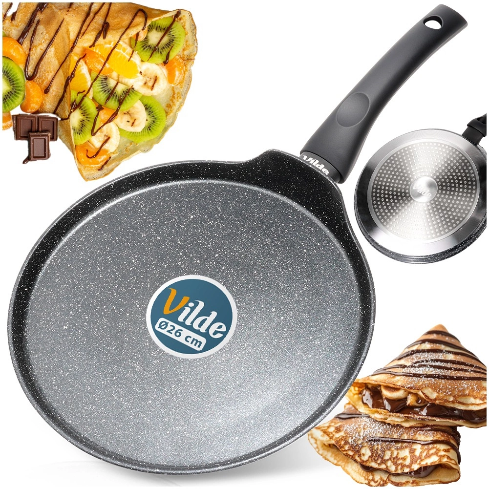 Připravte dokonale tenké palačinky, lívance i omelety díky široké, ploché ploše a nízkému okraji, které usnadňují nalévání těsta, podebrání a obracení. Granitová nepřilnavá vrstva v černé barvě umožňuje vařit s minimem tuku a zajistí snadné uvolnění pokrmu z pánve.