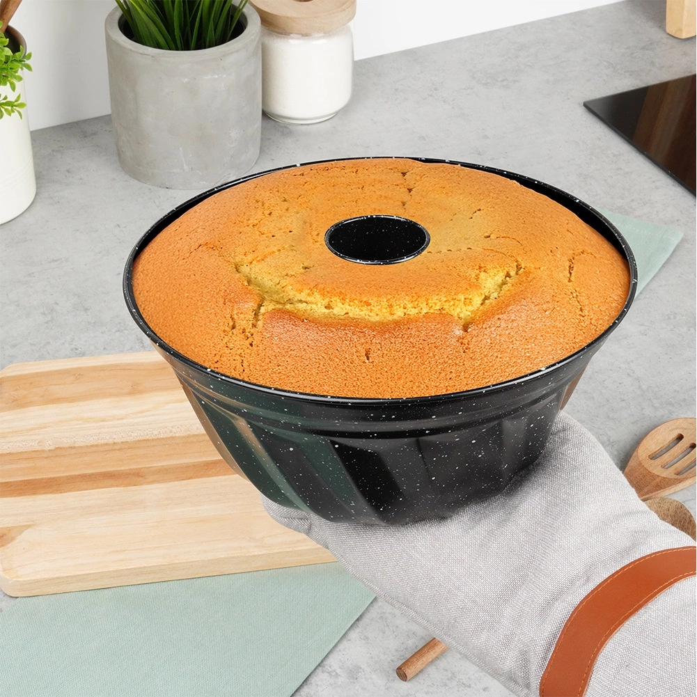 Praktická forma na bábovku s komínem o průměru 24,5 cm a výšce 12 cm z odolné uhlíkové oceli s granitovým nepřilnavým povrchem. Zajistí rovnoměrné pečení, snadné vyklopení a dekorativní tvar bábovky. Vhodná do plynových i elektrických trub do 230 °C.
