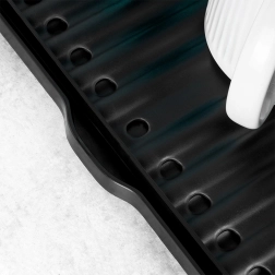 Žebrovaný povrch a drenážní otvory urychlují schnutí a zabraňují zadržování vody pod nádobím.