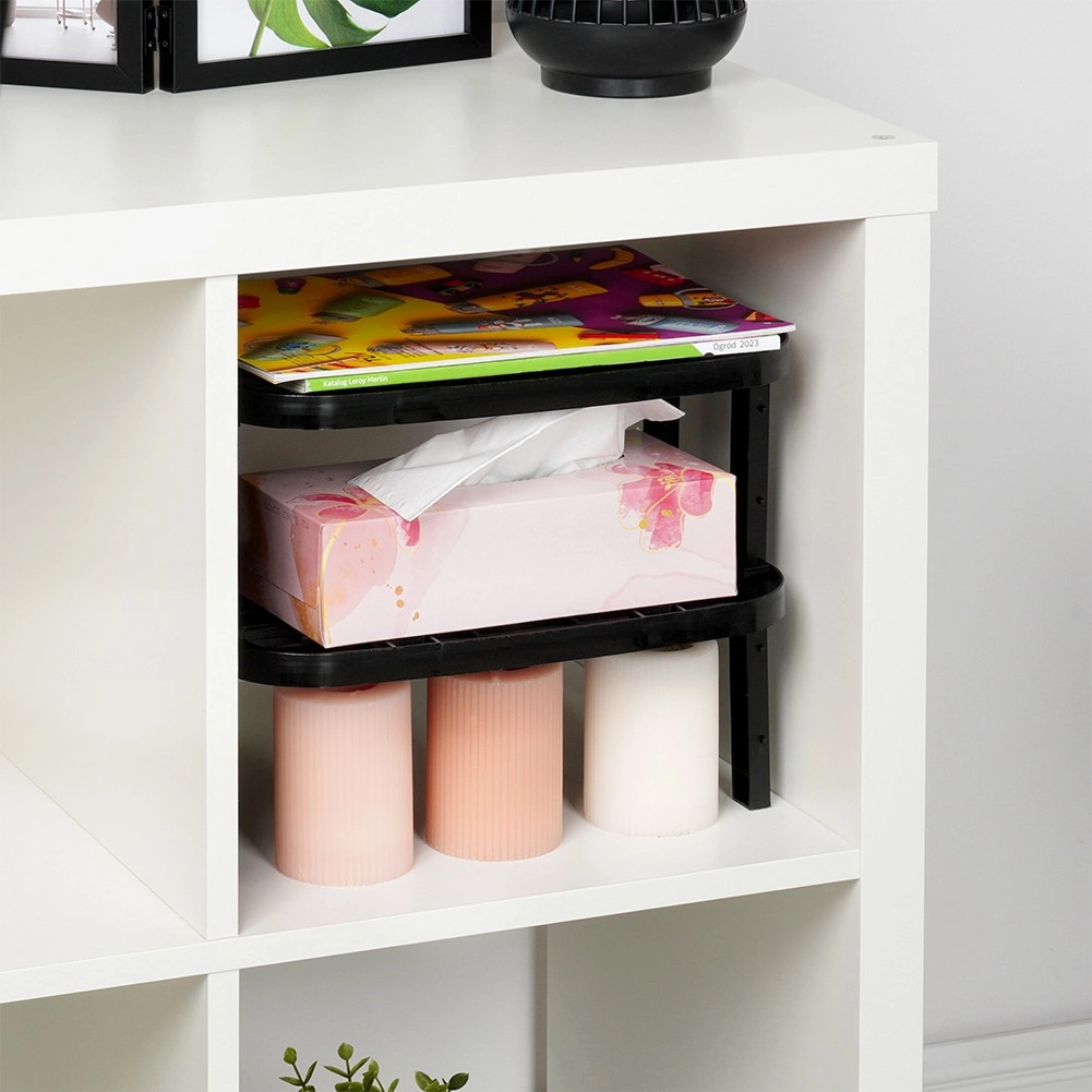 Praktická kuchyňská police v elegantní černé barvě pomáhá maximalizovat úložný prostor v skříňkách i na pracovní desce. Díky vyměnitelným nožkám ve dvou délkách snadno nastavíte výšku 14,5 cm nebo 11,5 cm. Ideální pro třídení talířů, hrnků, kořenek a dóz, stabilní a odolná konstrukce umožňuje také stohování více polic pro ještě lepší organizaci.