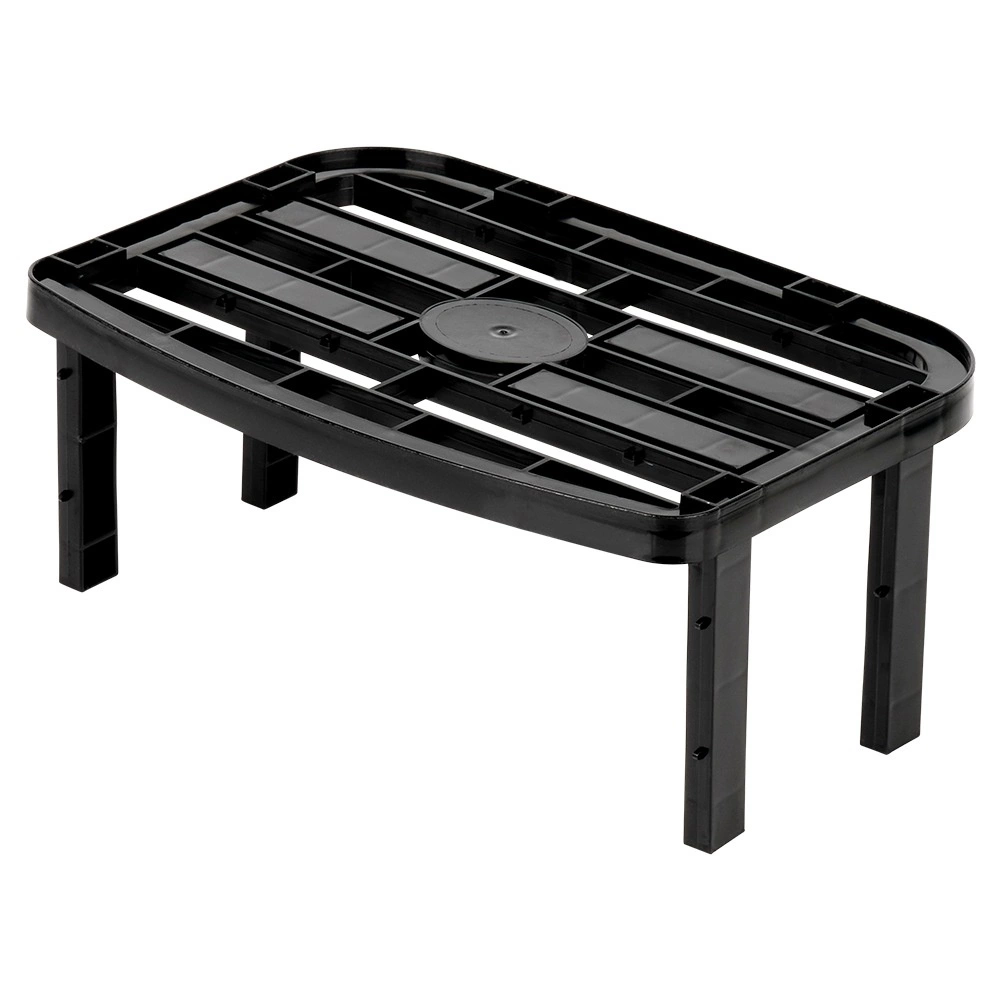 Robustní plastová konstrukce v černé barvě je stabilní, snadno se udržuje a díky dvěma sadám nožek (13 cm a 10,5 cm) si zvolíte výslednou výšku 14,5 cm nebo 11,5 cm. Police je vhodná do kuchyně, spižírny, koupelny i kanceláře a lze ji stohovat pro vytvoření více pater úložného prostoru.