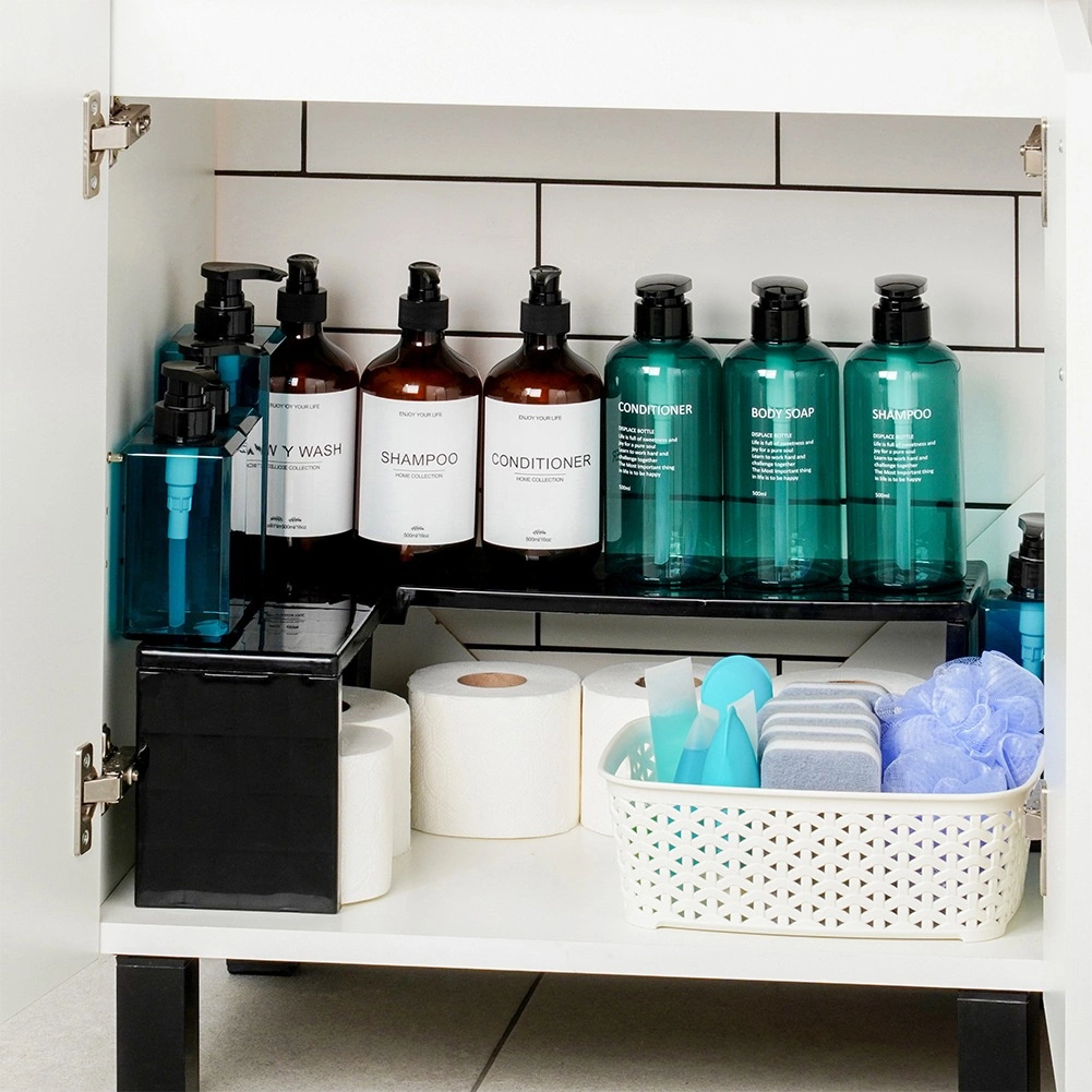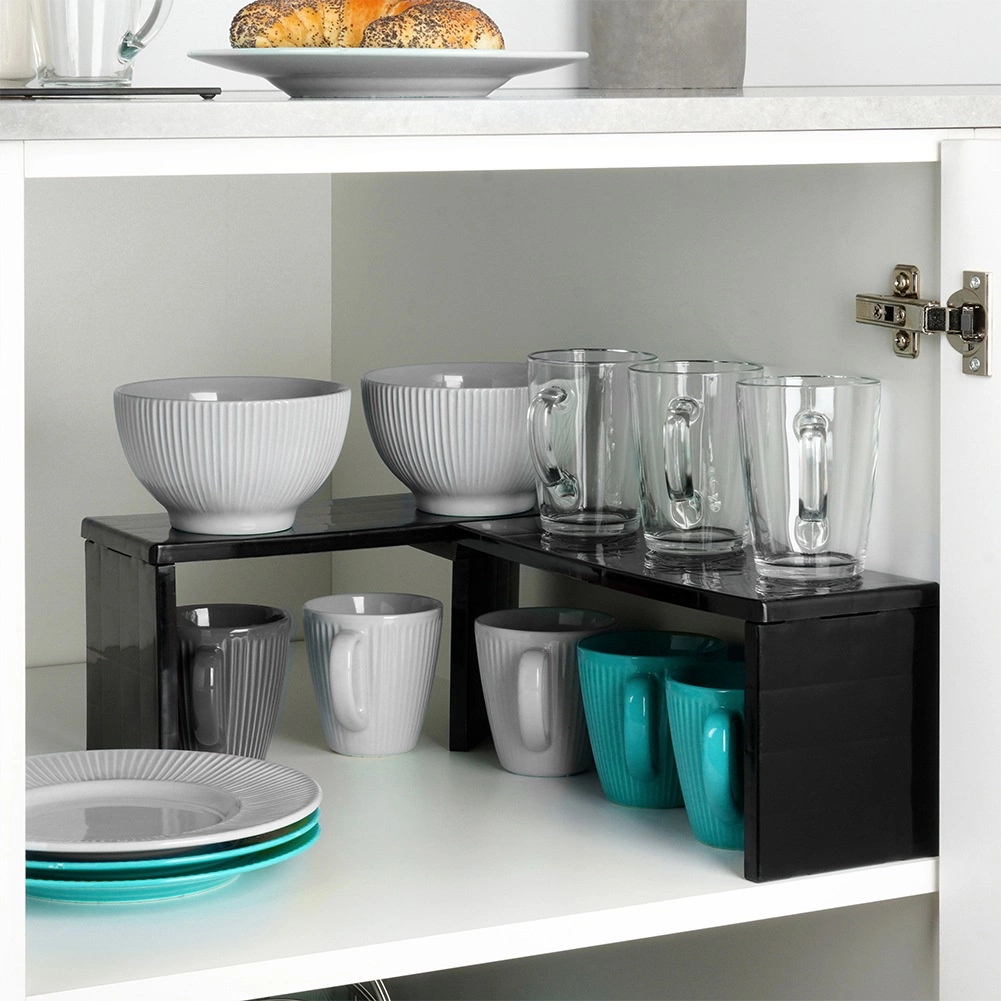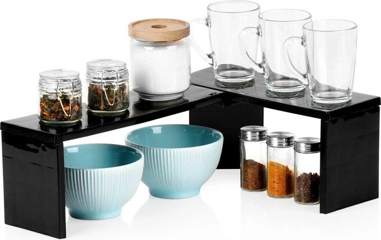 Praktická rohová kuchyňská police z odolného plastu pomůže udržet pořádek a lépe využít prostor na lince i ve skříňkách. Lze ji použít jako rohovou nebo podélnou variantu, čímž vytvoříte dva patra úložného prostoru pro kořenky, hrnky, misky či dózy. Stabilní konstrukce v elegantní černé barvě se hodí do kuchyně, spíže, koupelny i kanceláře.