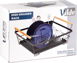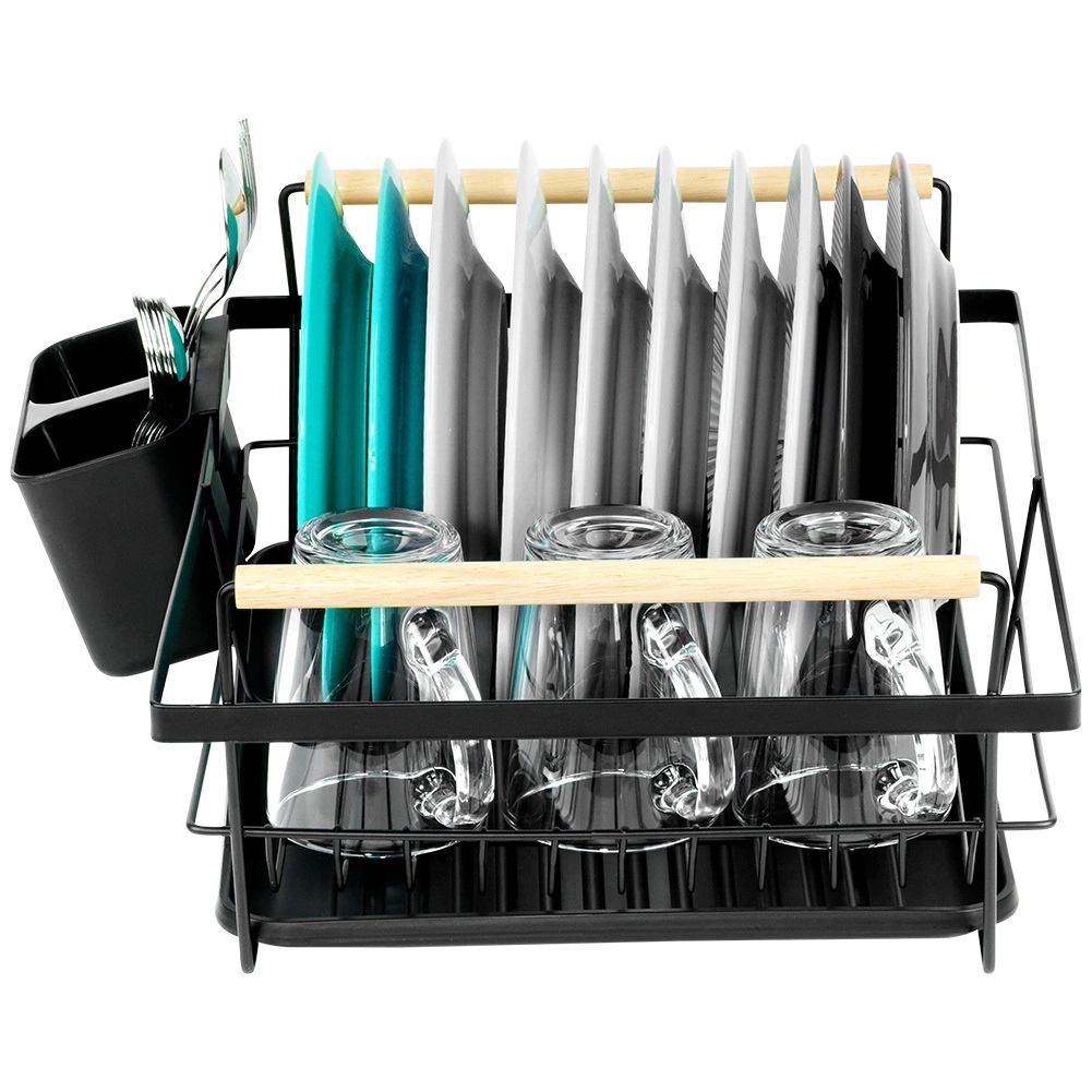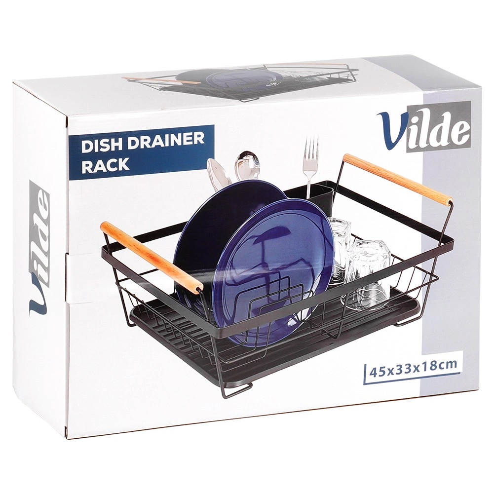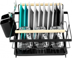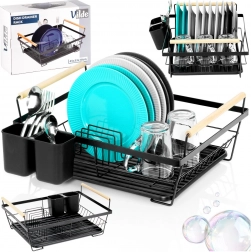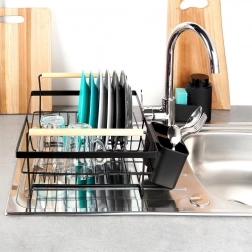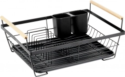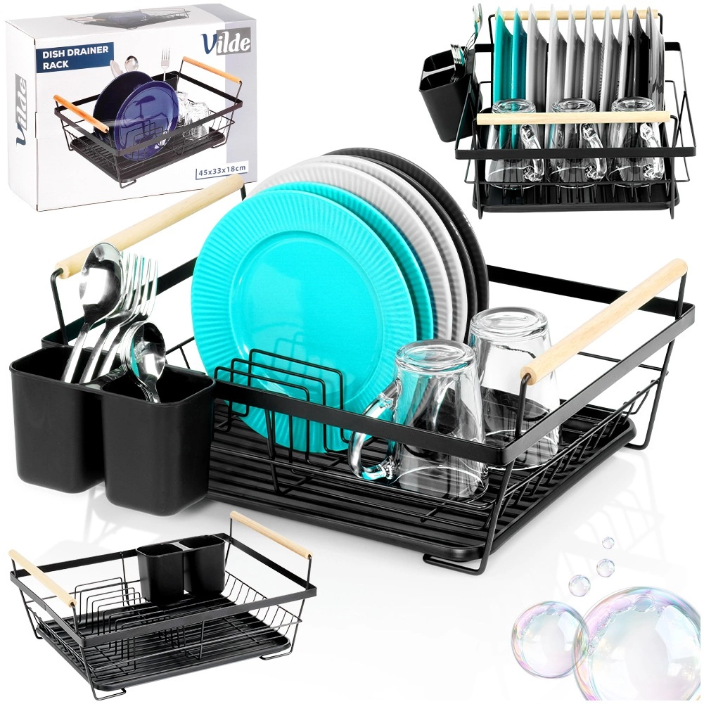Elegantní černý odkapávač na nádobí kombinuje pevnou kovovou konstrukci s praktickou organizací pro talíře, sklenice a příbory. Vyjímatelná odkapávací miska spolehlivě zachytává vodu a udržuje kuchyňskou linku bez mokrých skvrn. Dvě dřevěná madla umožňují snadné přenášení, zatímco nadčasový design se hodí do moderních i klasických kuchyní.