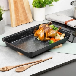 Robustní obdélníková forma s granitovým povrchem se postará o spolehlivý výsledek pečení bez připalování. Nepohlcuje pachy ani tekutiny a díky kvalitní uhlíkové oceli výborně vede teplo, takže pokrmy jsou propečené rovnoměrně po celé ploše.