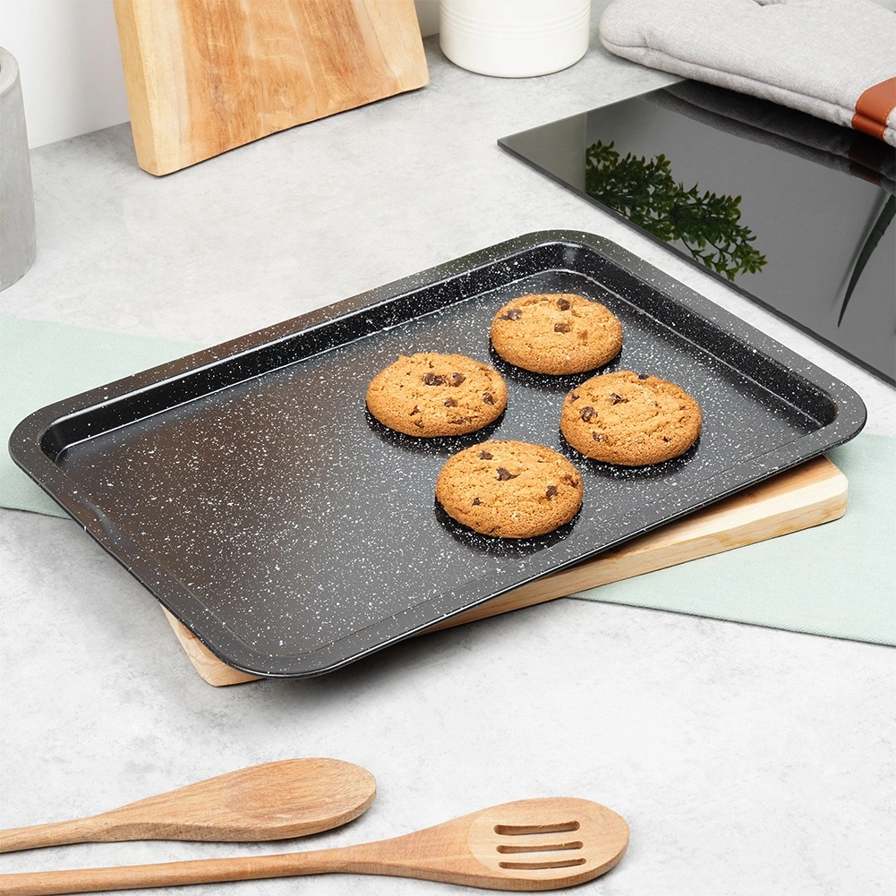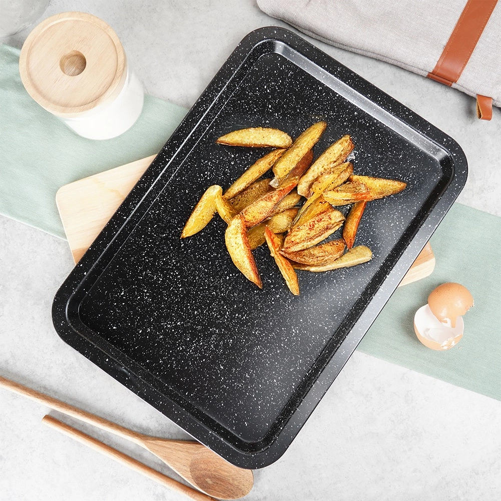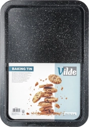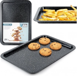 Obdélníkový plech z kvalitní uhlíkové oceli s granitovou nepřilnavou povrchovou úpravou odolává teplotám až 230 °C, nepohlcuje pachy a nezadržuje tekutiny. Je vhodný do plynových i elektrických trub a díky rovnoměrnému rozvodu tepla docílíte vždy skvělých výsledků.