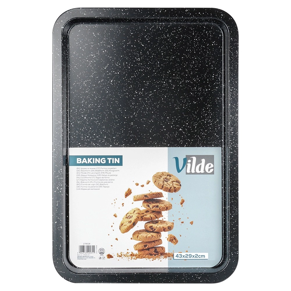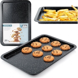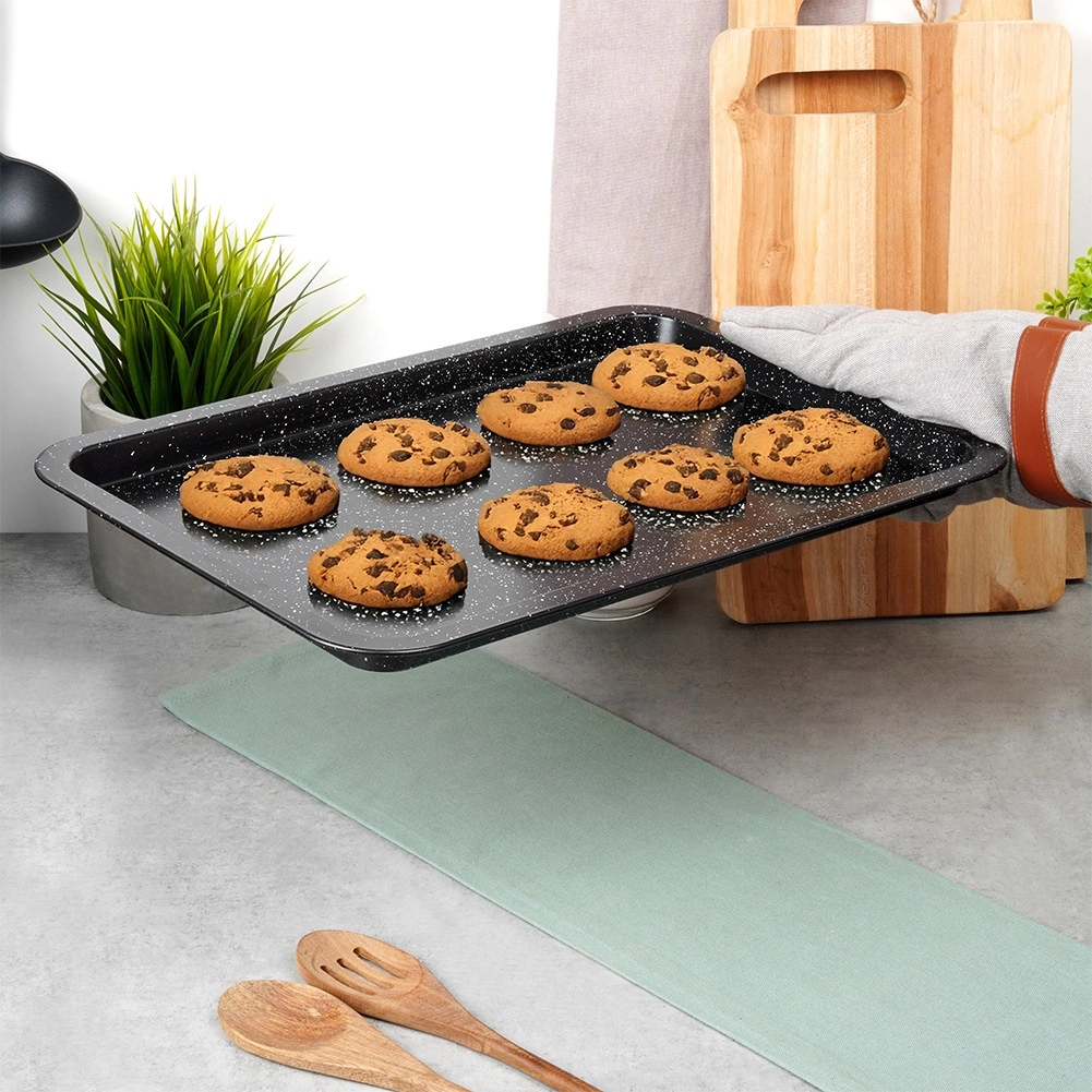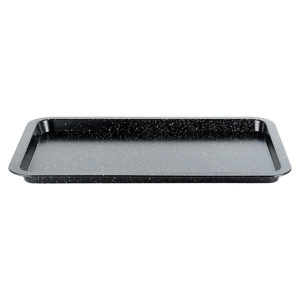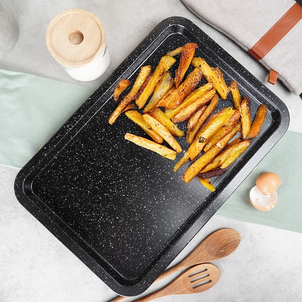 Univerzální granitový plech na pečení o rozměrech 43 × 29 × 2 cm pro každodenní pečení i pečení na sváteční stůl. Díky povrchu s granitovou úpravou nabízí nepřilnavost, rovnoměrnou distribuci tepla a snadné čištění. Vyšší okraje zajišťují bezpečné přenášení a zabraňují vytékání šťáv. Ideální na maso, zeleninu, sušenky, hranolky i domácí pizzu.