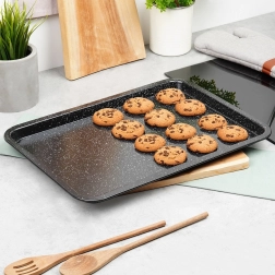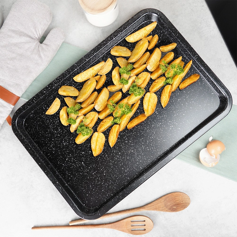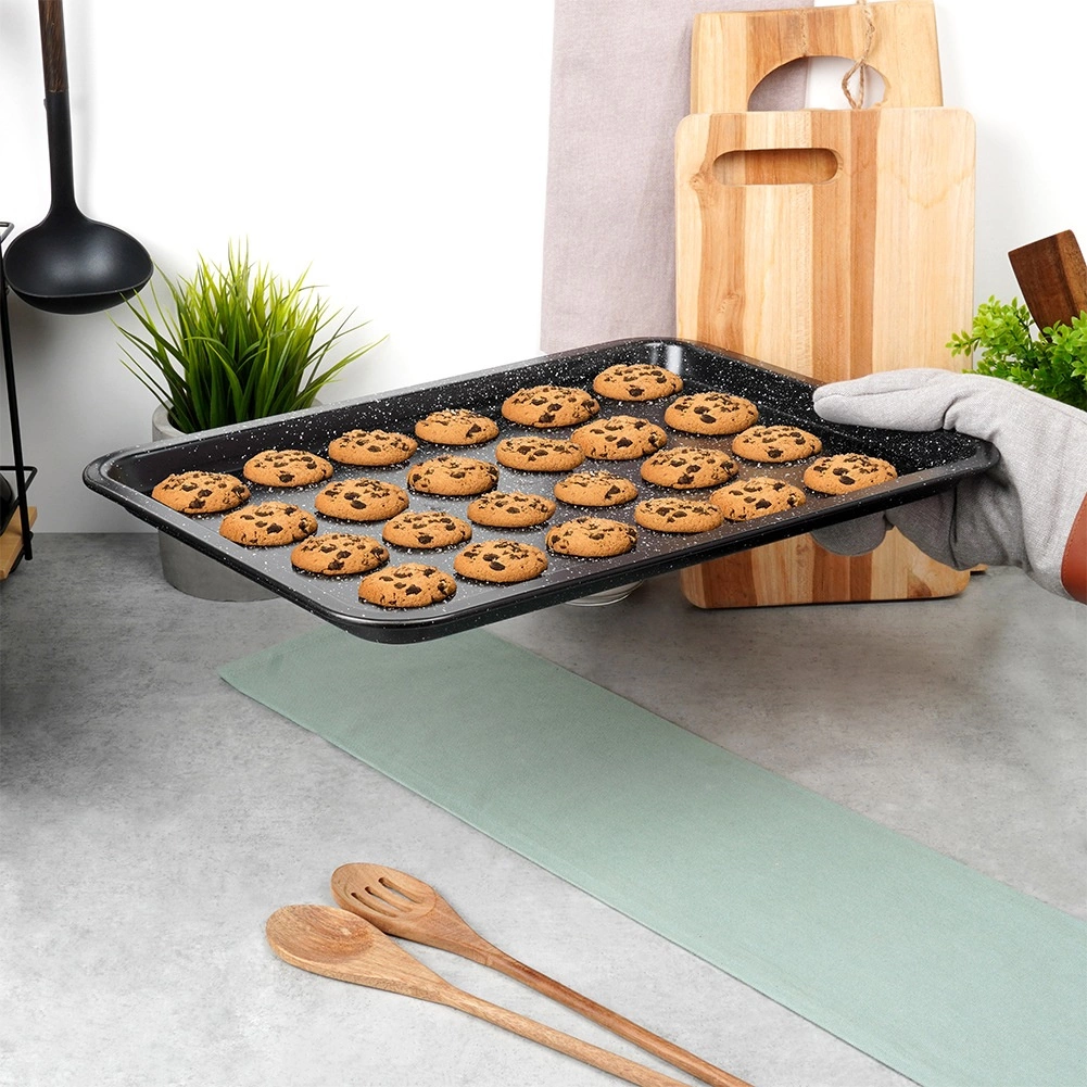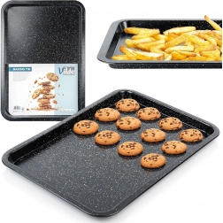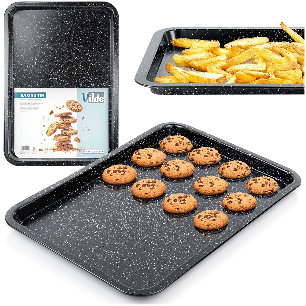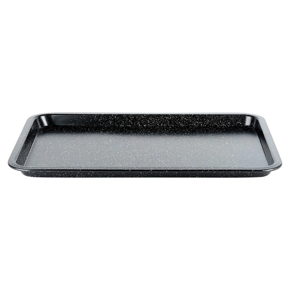 Velký obdélníkový plech z odolné uhlíkové oceli s granitovou nepřilnavou vrstvou je ideální pro pečení masa, zeleniny, sušenek, koláčů i domácí pizzy. Materiál odolá teplotám až 230 °C, nenasákne pachy ani tekutiny a rovnoměrně rozvádí teplo – vaše pokrmy budou vždy dokonale propečené.