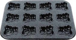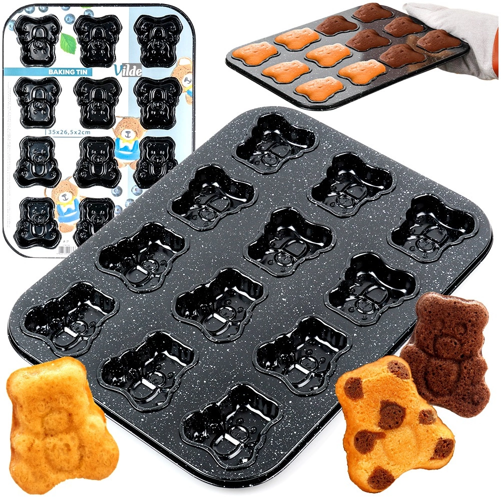 Vytvářejte hravé sušenky či mini muffiny s dokonalými detaily díky formě z kvalitní uhlíkové oceli s granitovou nepřilnavou povrchovou úpravou. Forma o rozměrech 35 × 26,5 × 2 cm pojme 12 porcí, každá ve tvaru medvídka o velikosti přibližně 6,5 × 6 cm. Materiál výborně vede teplo a peče rovnoměrně, takže budou vaše dobroty krásně propečené a snadno se vyklopí.