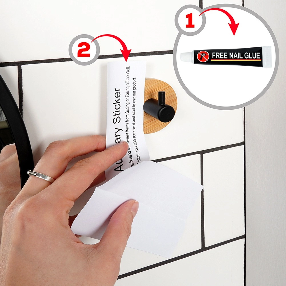 Instalace je rychlá a čistá: háček upevníte pomocí přiloženého lepidla a pomocných samolepek. Pro nejlepší výsledek před montáží důkladně očistěte a odmastěte povrch a nechte lepidlo vytvrdnout po dobu cca 72 hodin před prvním zatížením.