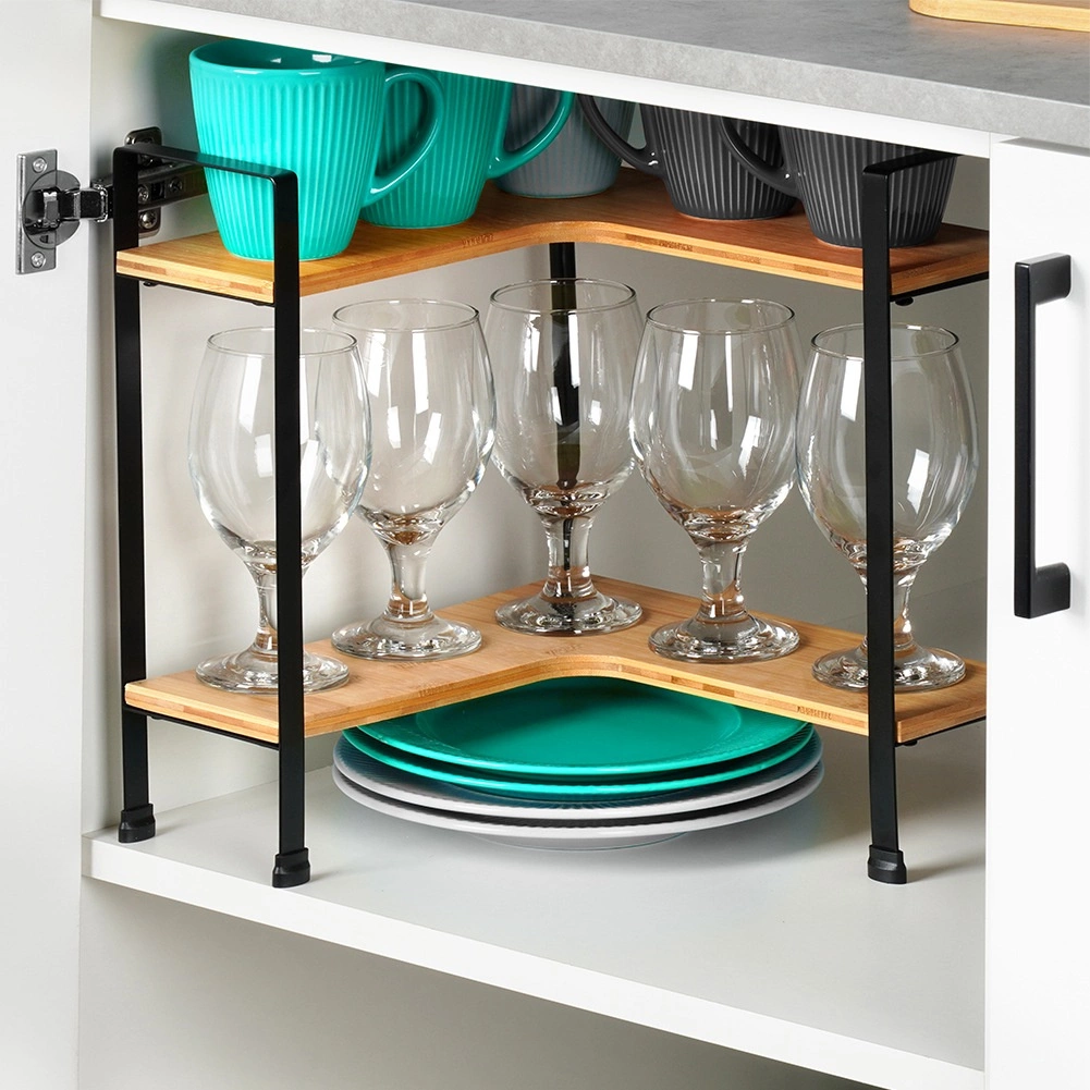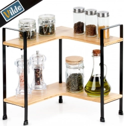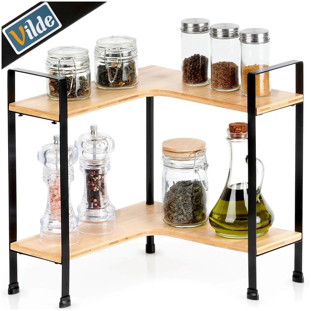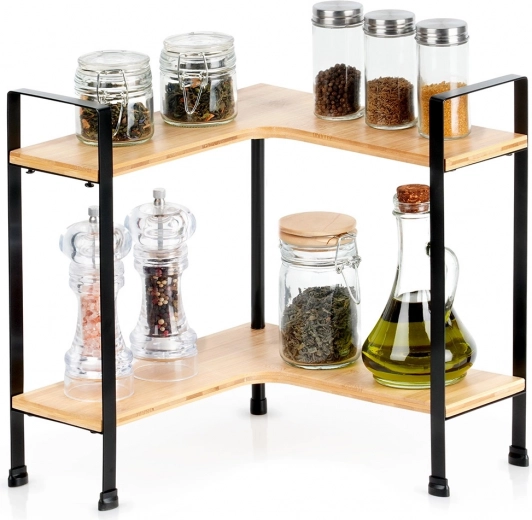Udržte kuchyň přehlednou a stylovou s touto rohovou poličkou z bambusového dřeva na pevné kovové konstrukci. Nabízí 2 úrovně úložného prostoru, L tvar pro rohy a stabilní kovové nožky s ochranou povrchu. Ideální pro kořenky, hrnky, dózy i misky, šetří místo na pracovní desce a hodí se do moderních interiérů.