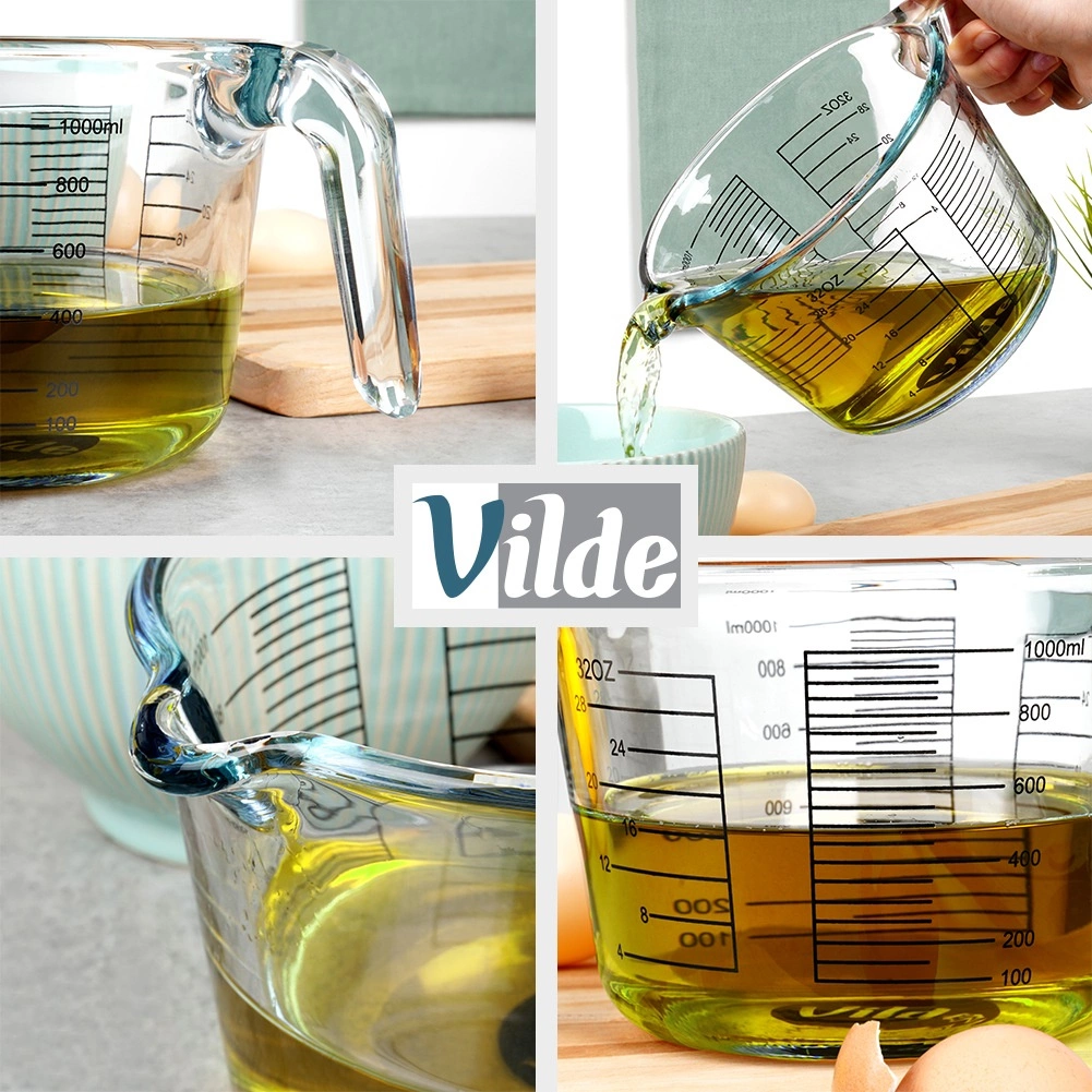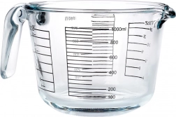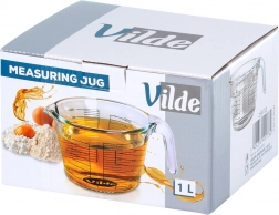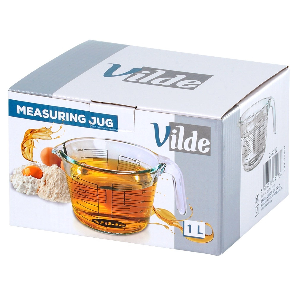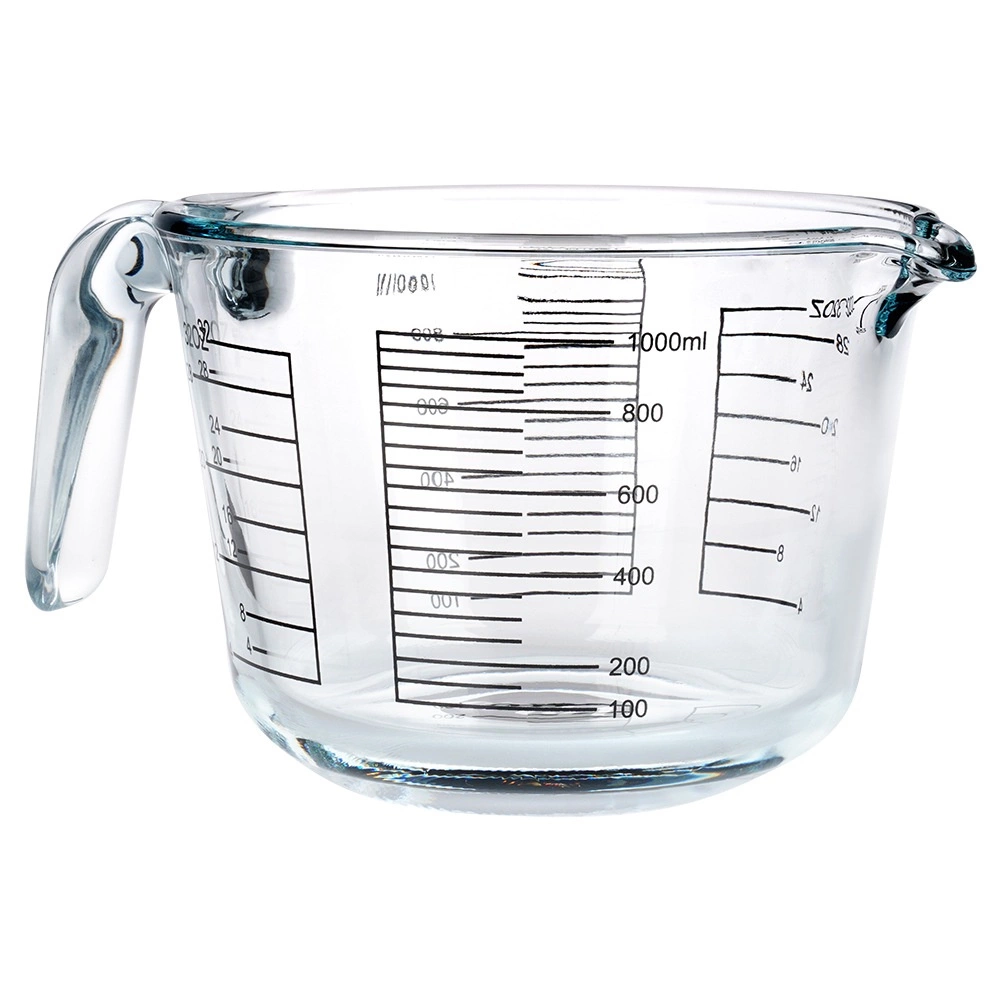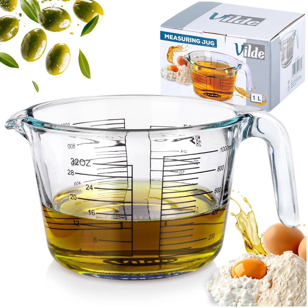 Praktická skleněná odměrka o objemu 1 l s ergonomickým uchem a výlevkou pro snadné nalévání. Díky čitelné stupnici v ml a fl oz změříte tekutiny přesně a pohodlně. Vyrobena z borosilikátového skla, které je odolné vůči teplotním šokům, vhodná do myčky, mikrovlnky i trouby.
