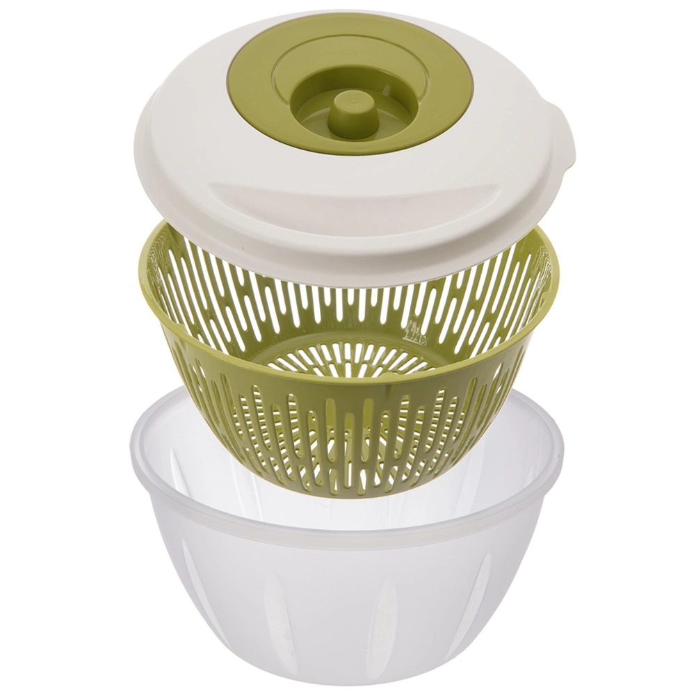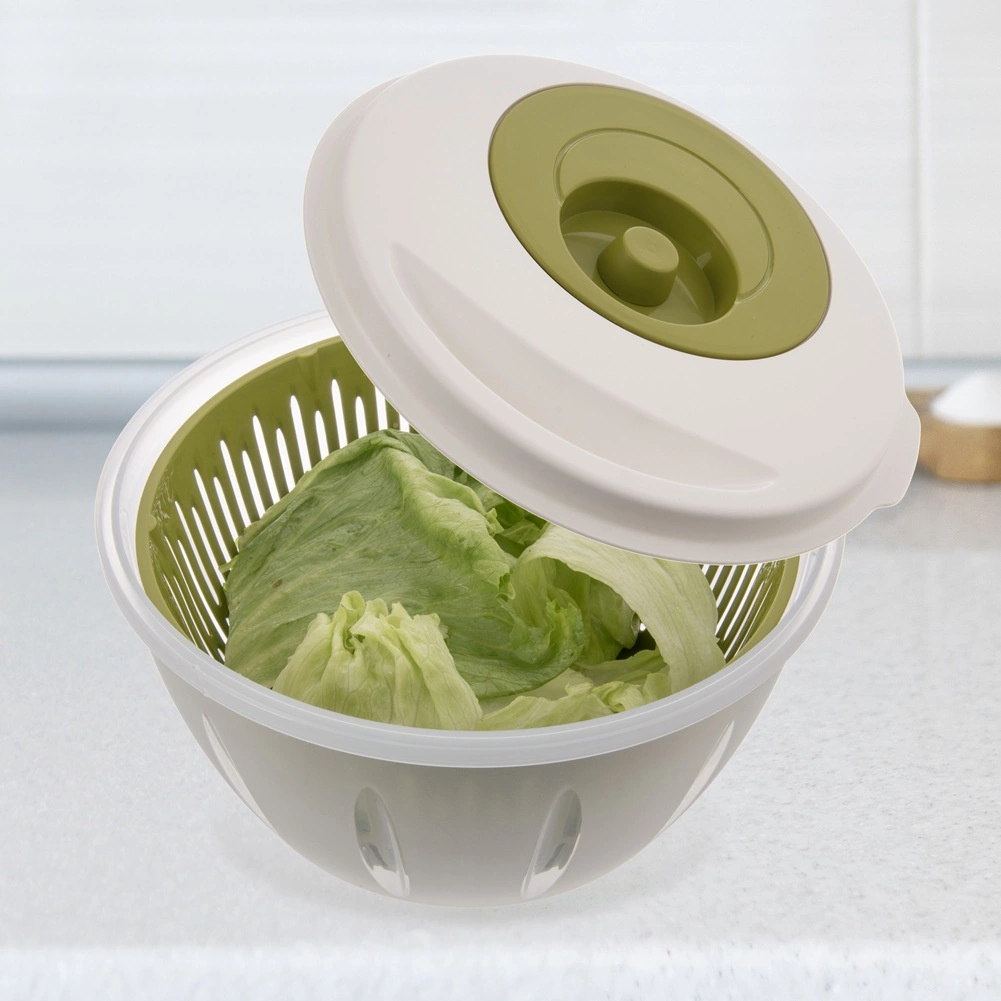 Ruční otočný mechanismus ve víku roztočí vnitřní koš a během pár sekund odstraní přebytečnou vodu z listů pro dokonale křupavé saláty.