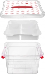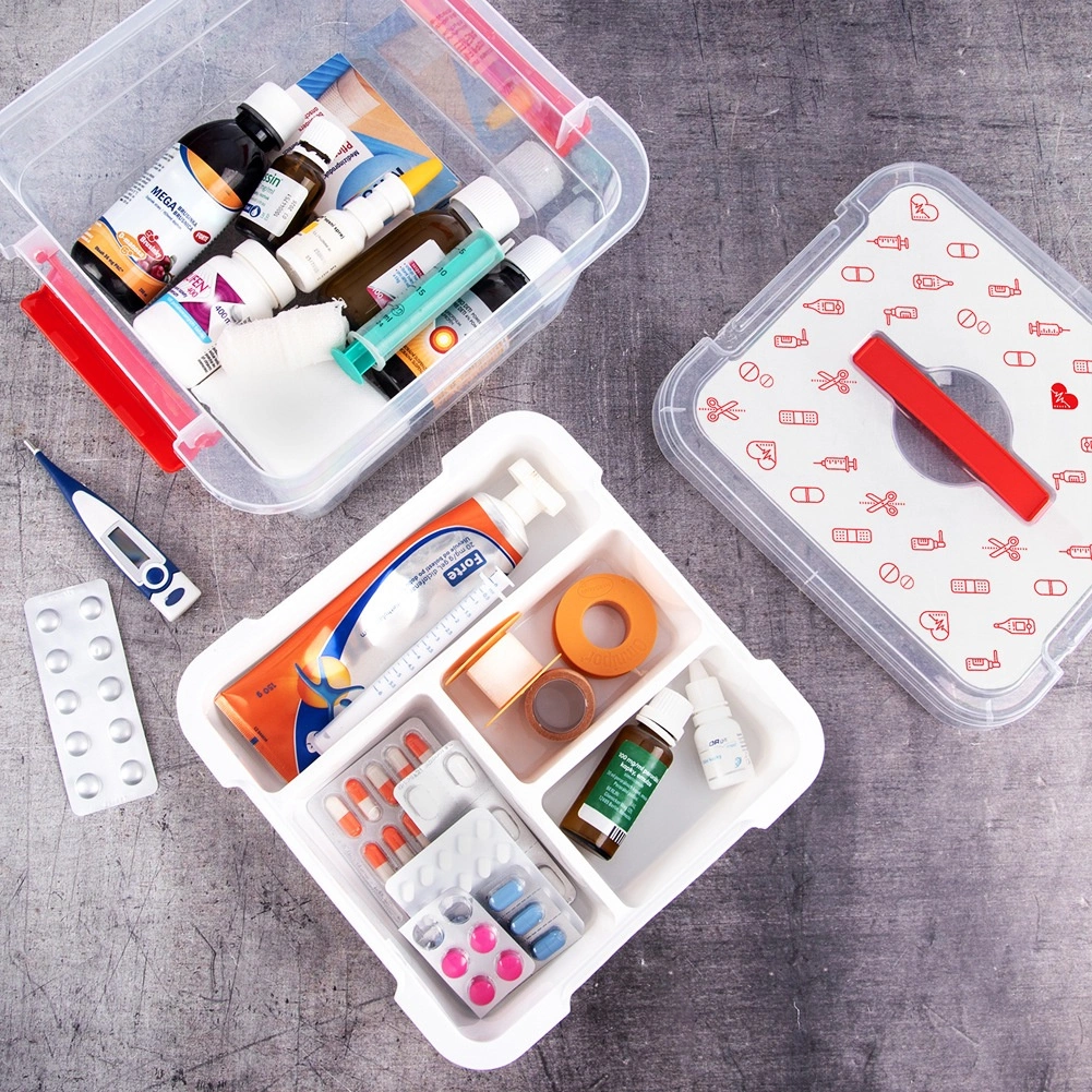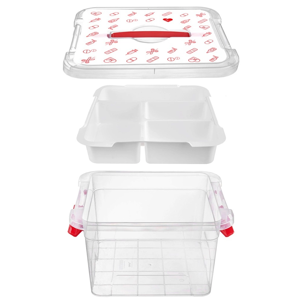 Box je vyroben z odolného plastu s pevnými uzavíracími klipy a ergonomickým uchem pro bezpečné přenášení. Víko s červenými ikonami (tablety, teploměry, stříkačky, lahvičky, náplasti) jasně naznačuje určení – domácí lékárnička. Hodí se do domácností, lékařských zařízení, lékáren i domovů pro seniory.