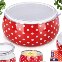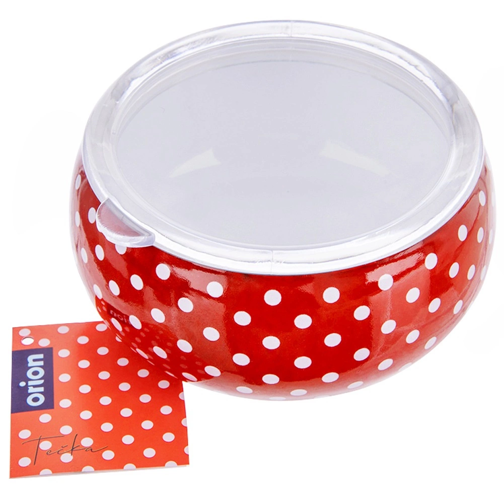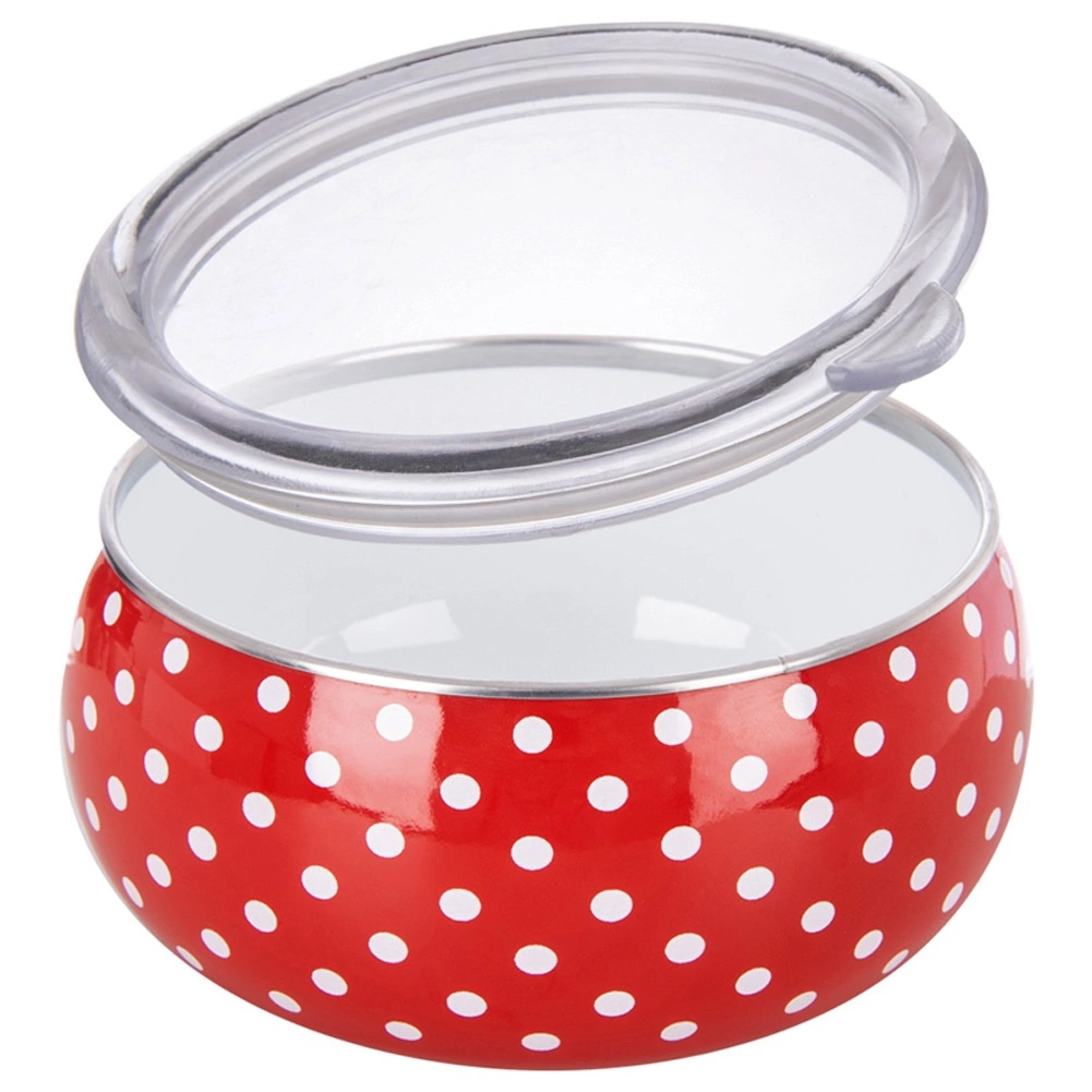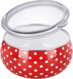 Kulatá miska z kolekce Tečka zaujme retro designem s puntíky a praktickým průhledným víkem, díky němuž ihned vidíte obsah. Smalt je zdravotně nezávadný a vhodný i pro alergiky. Miska má rozměry 15,5 × 15,5 × 7,5 cm a objem 1 l – perfektní na saláty, přílohy, polévky, ovoce či svačiny.