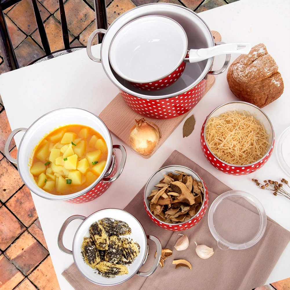 Kvalitní smalt na oceli je hygienický, snadno se čistí a v kombinaci s bílými puntíky dodá kuchyni nadčasový vzhled.