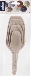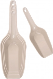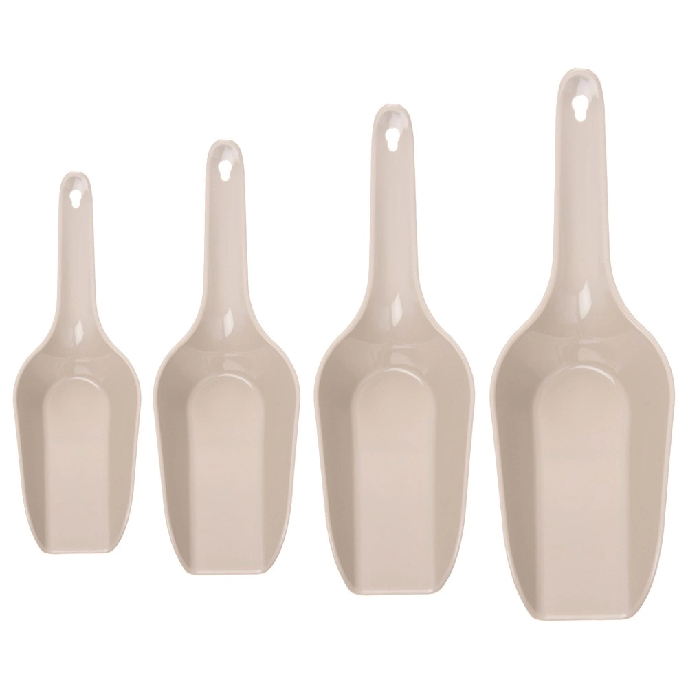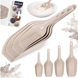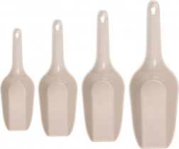 Praktická sada čtyř naběraček v různých velikostech pro snadné nabírání a přesypávání sypkých potravin doma i v gastronomii. Odolné plastové provedení v béžové barvě, pohodlné rukojeti s otvorem na zavěšení a možnost mytí v myčce. Všestranné použití na mouku, cukr, kávu, vločky, krupici, led či krmivo pro domácí mazlíčky. Hladký povrch pro snadné čištění a úsporné stohovatelné uložení.