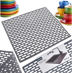 Promyšlená perforovaná struktura umožňuje volný průtok vody a brání jejímu hromadění. Podložka je snadno omyvatelná, flexibilní a skvěle přilne k povrchu. Její kompaktní rozměr 33 × 28 cm a neutrální vzhled se hodí do moderních i klasických kuchyní.
