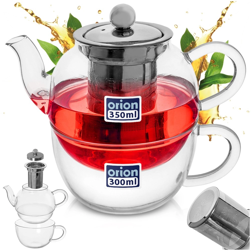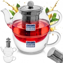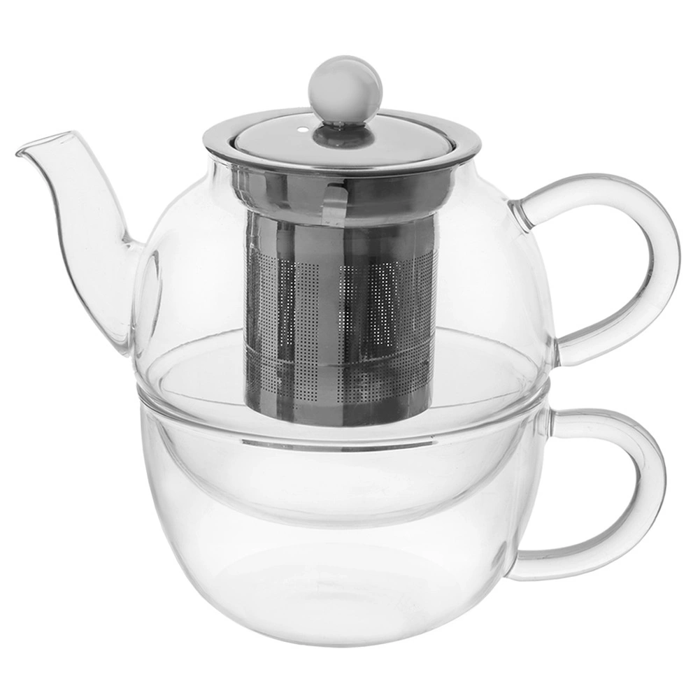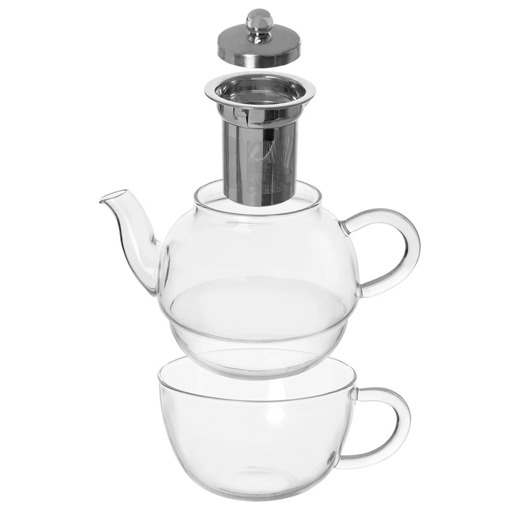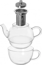 Tato 2dílná sada kombinuje skleněnou konvičku o objemu 350 ml s hrnkem 300 ml, které lze prakticky skladovat zasunuté do sebe. Konvička je vybavena jemným nerezovým sítkem pro pohodlné louhování sypaného čaje i bylin, průhledné sklo umožňuje kontrolu intenzity nálevu.