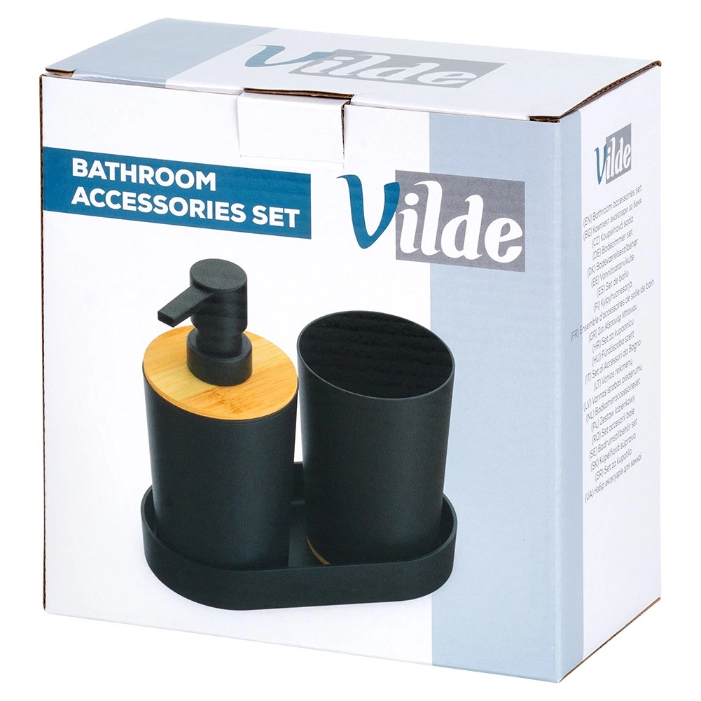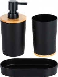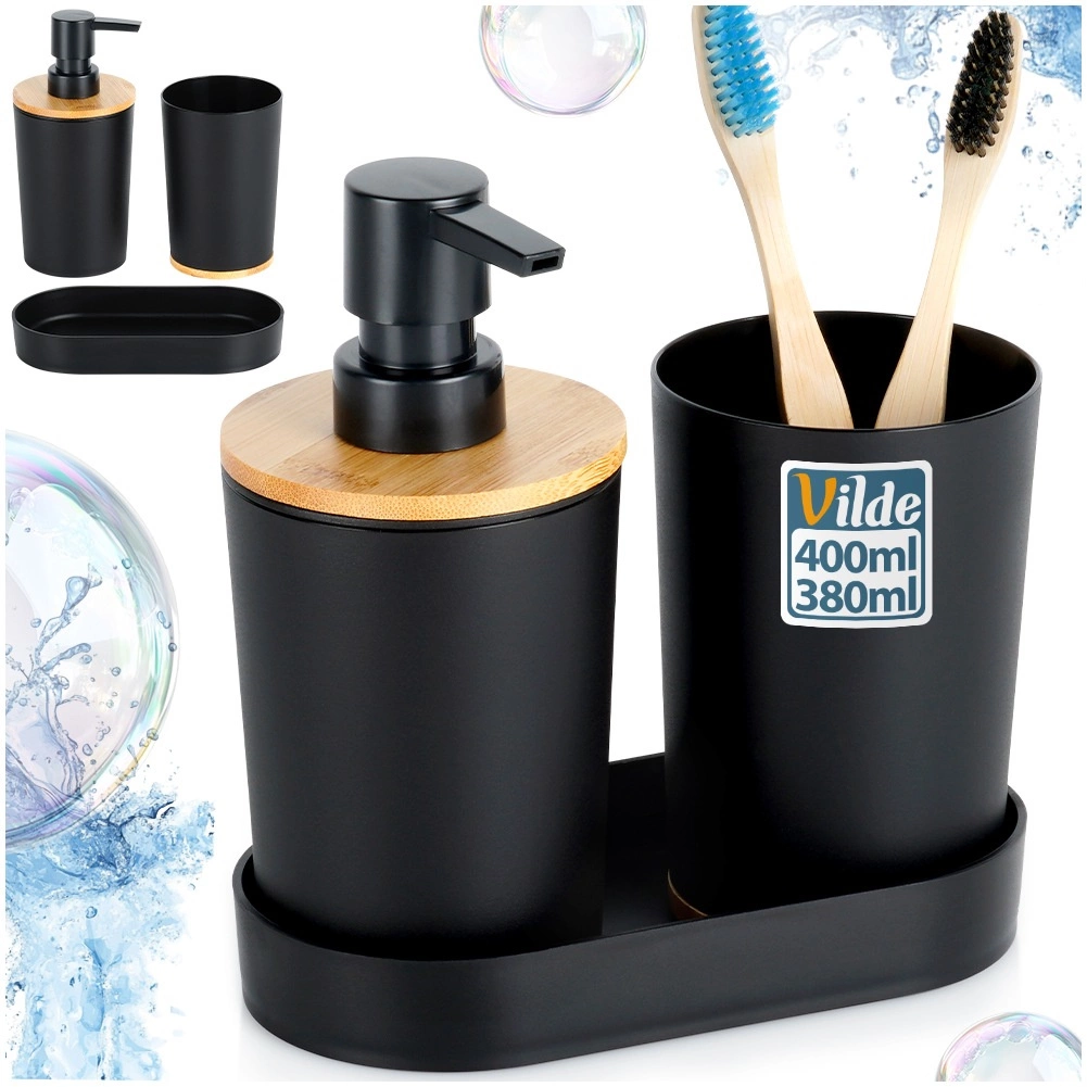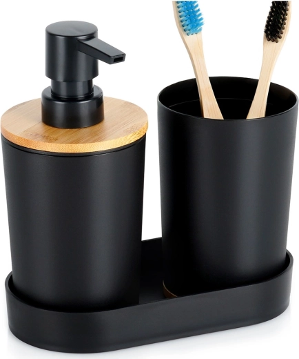 Elegantní černá koupelnová sada se skládá z dávkovače mýdla, kelímku na kartáčky a kompaktní podložky. Kombinuje matně černé provedení s bambusovými detaily pro moderní vzhled, šetří místo u umyvadla a pomáhá udržet pořádek a organizaci v každé koupelně.