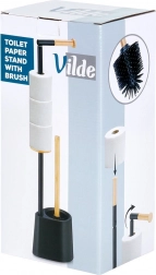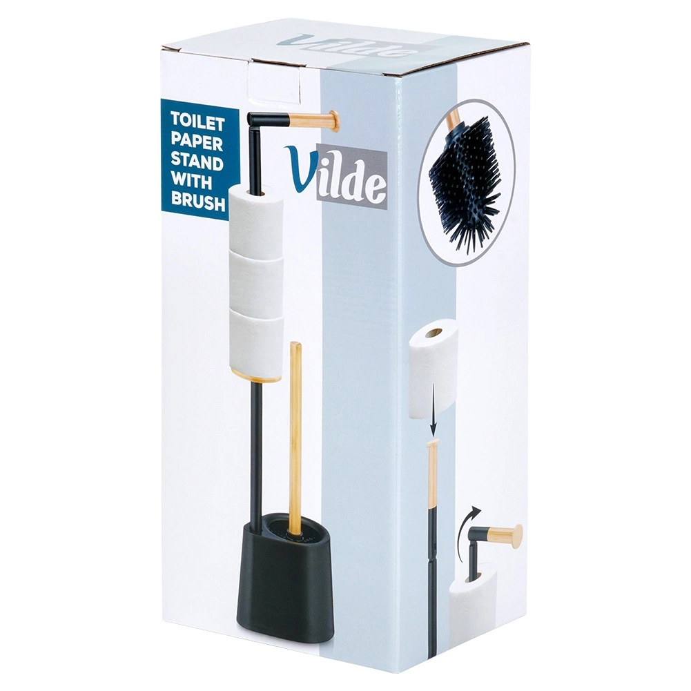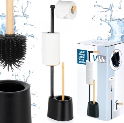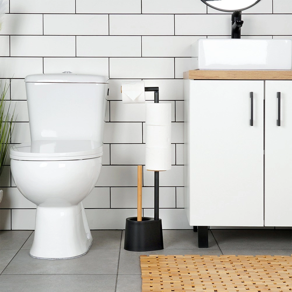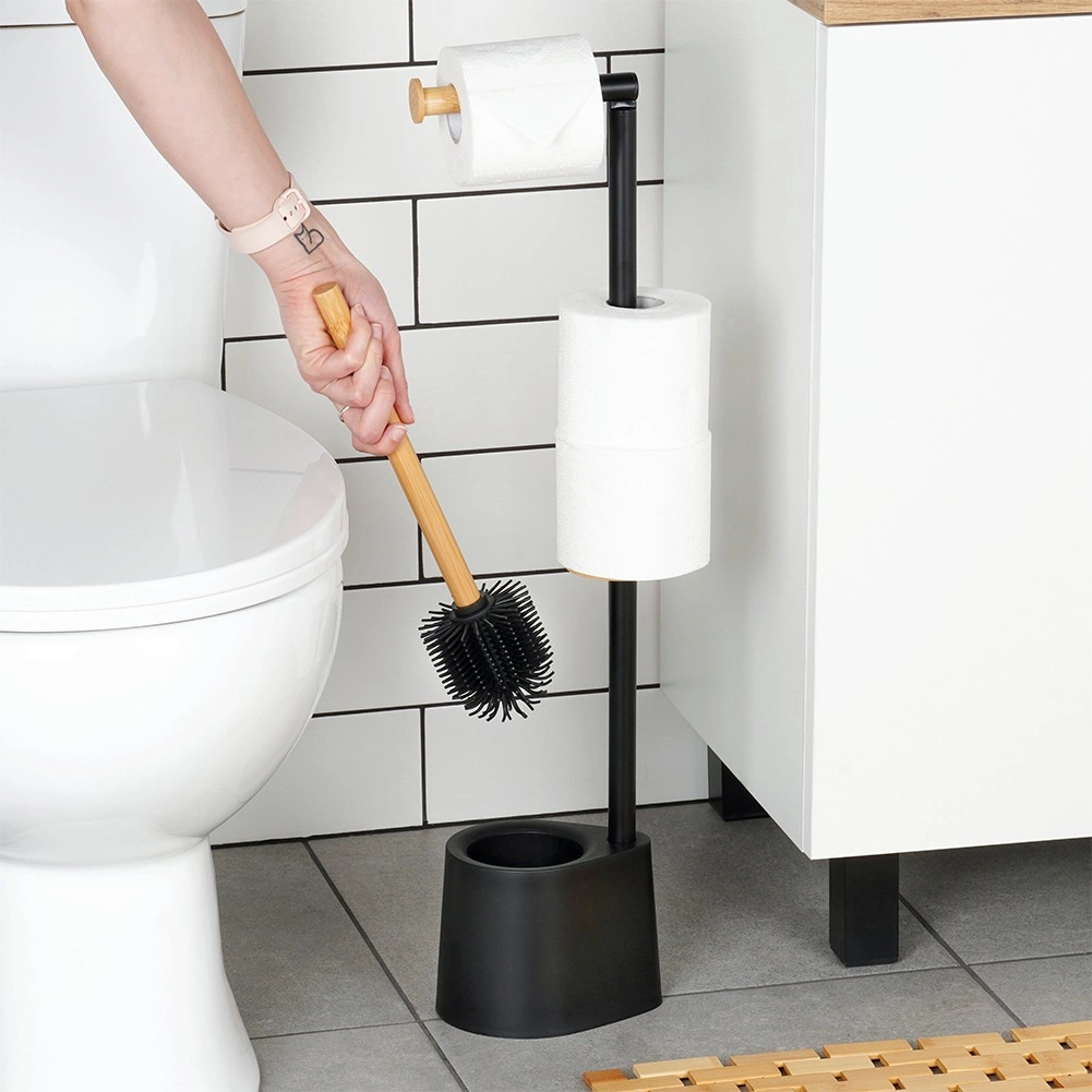Udržujte koupelnu přehlednou díky promyšlenému stojanu, který podává a zároveň skladuje toaletní papír a obsahuje WC štětku se silikonovými štětinami pro hygienické čištění. Minimalistický design v černé barvě s přírodním akcentem bambusu působí vkusně a nadčasově.