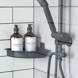 Trojúhelníkový tvar efektivně využívá roh sprchy a udržuje kosmetiku na dosah, aniž by překážela.