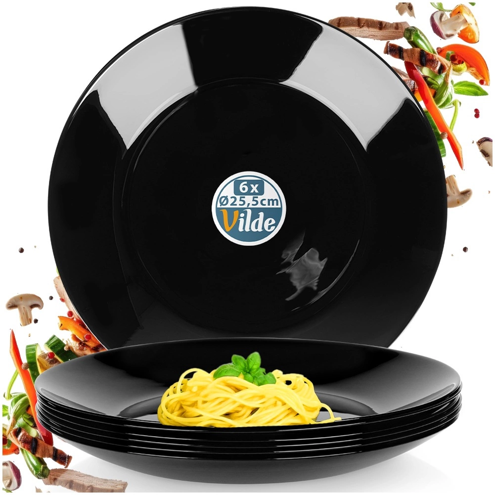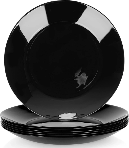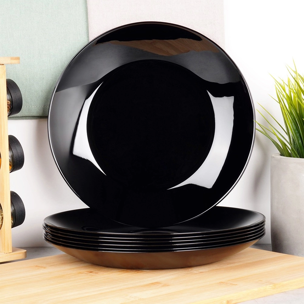 Sada 6 univerzálních mělkých talířů z kvalitního opálového skla s elegantním černým leskem. Díky nadčasovému vzhledu a odolnému zpracování skvěle doplní vaši stolní výbavu – od každodenního oběda až po sváteční hostinu. Materiál připomíná porcelán, přesto je praktický na údržbu a dlouhodobě odolný.