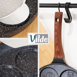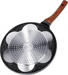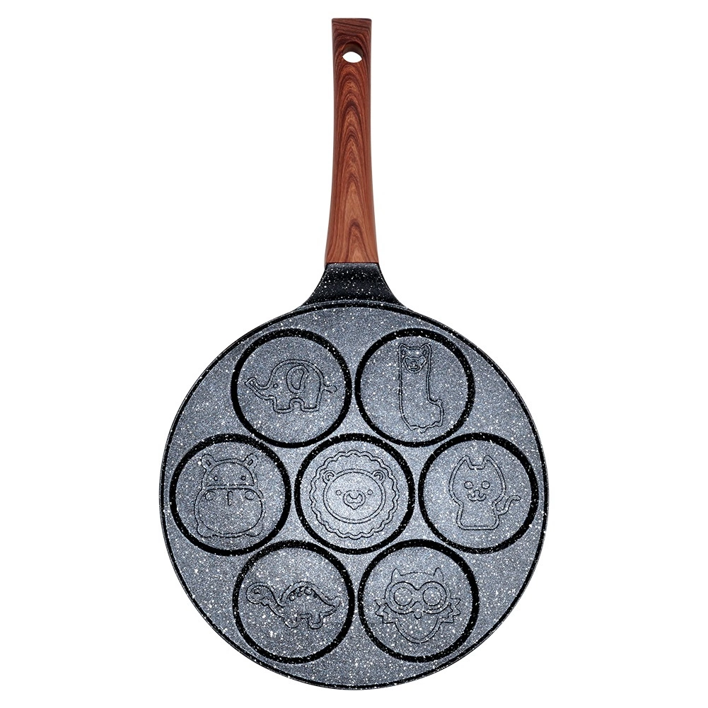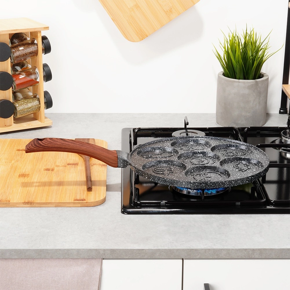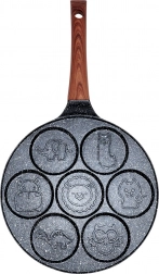 Tato stylová pánev z linie BLACK & WOOD je ideální pro vajíčka, lívance i mini palačinky. Sedm kulatých jamek s hravými reliéfy zvířátek vytváří krásné, jednotné tvary a přidá radost do každého snídaňového rituálu. Odolná hliníková konstrukce s granitovou úpravou zajišťuje rychlý ohřev a dlouhou životnost.
