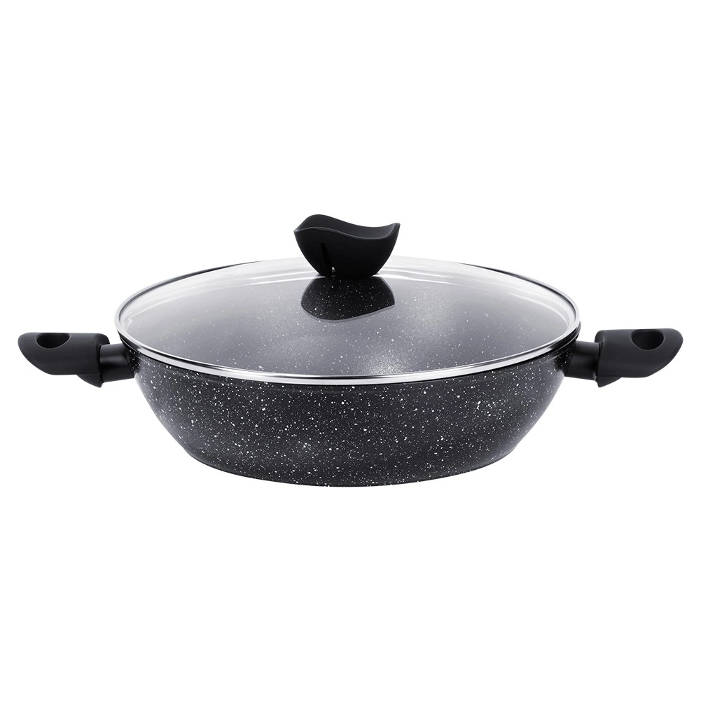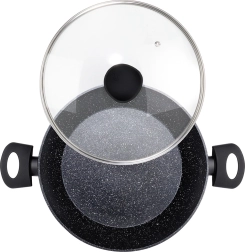 Hluboká pánev BLACK LINE kombinuje moderní design a každodenní praktičnost. Robustní hliníkové tělo se granitovou nepřilnavou vrstvou usnadňuje přípravu zdravých jídel a minimalizuje připalování. Průhledná skleněná poklice s parním ventilem umožní mít dění v pánvi pod kontrolou a udržet šťavnatost pokrmů.
