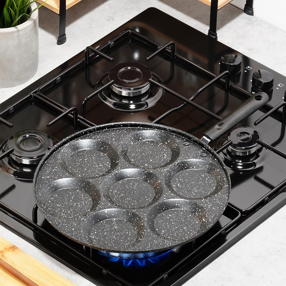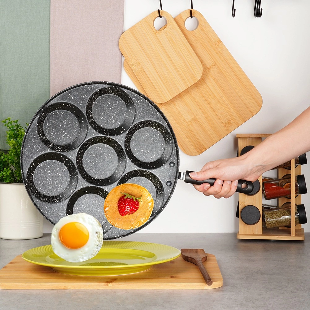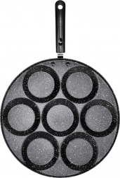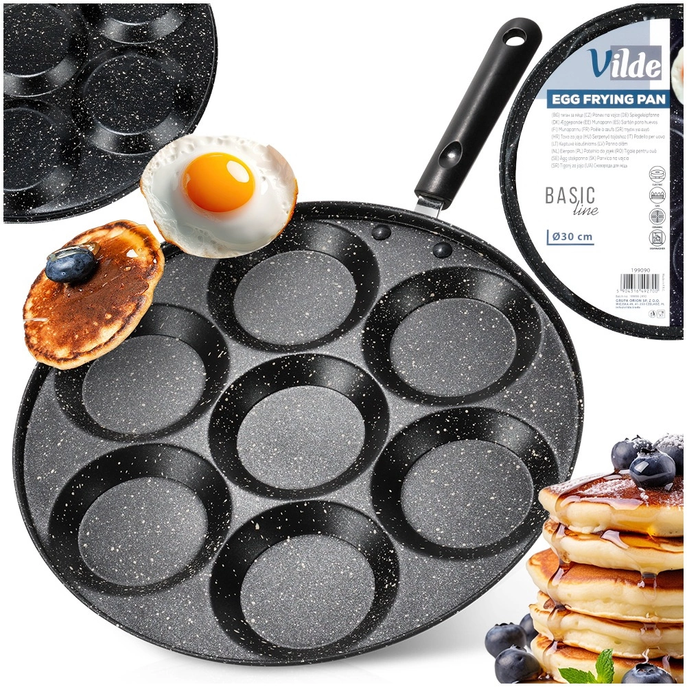 Objevte všestrannou pánev pro rychlou a pohodlnou přípravu snídaní. Sedm samostatných forem o průměru 9 cm vytváří rovnoměrné a jednotné porce, ideální pro vejce, lívanečky i poffertjes. Kvalitní nepřilnavá granitová úprava minimalizuje připékání a umožňuje vaření s menším množstvím oleje.
