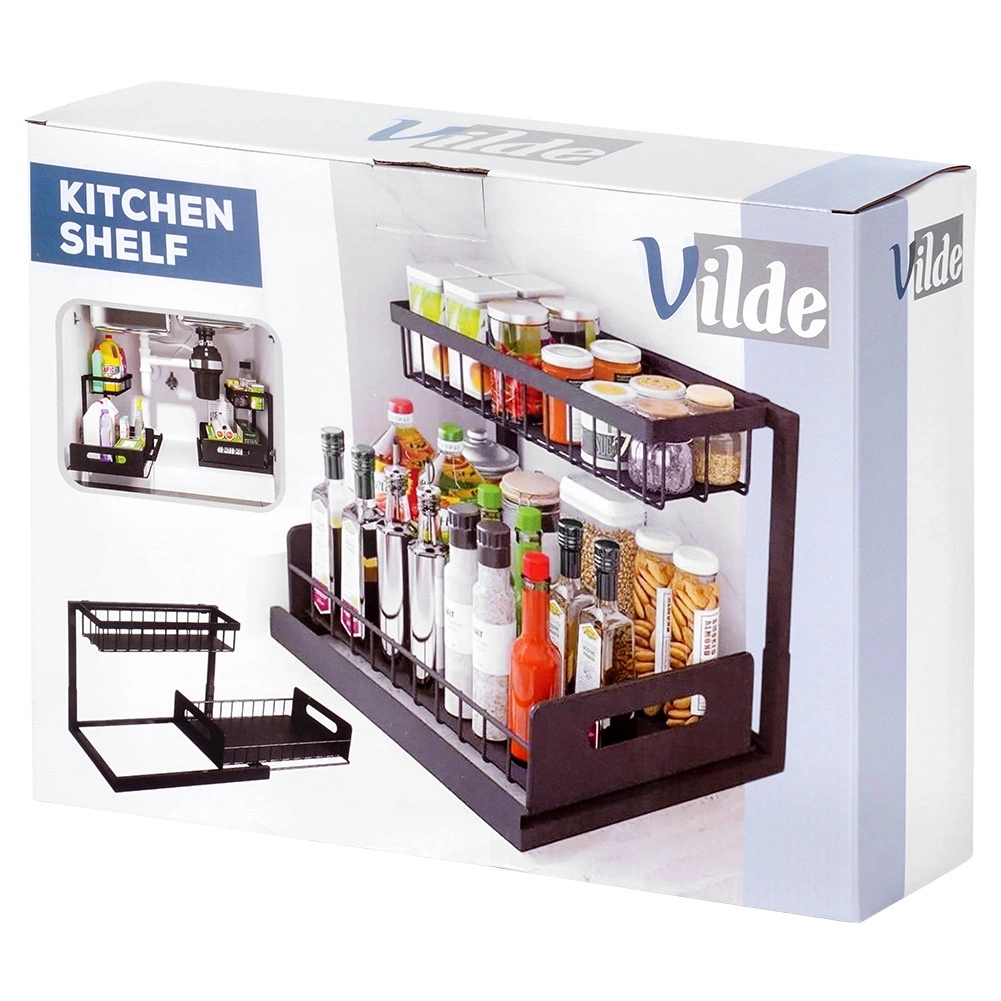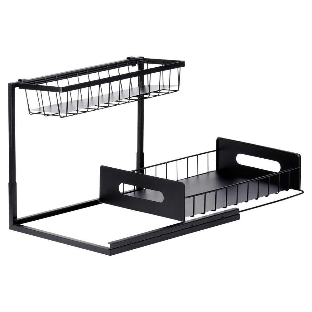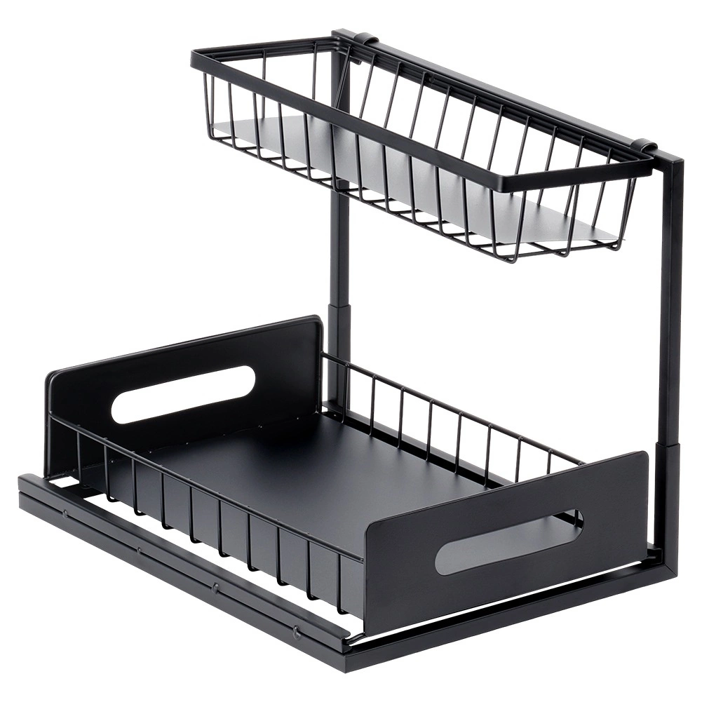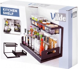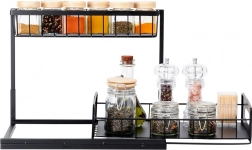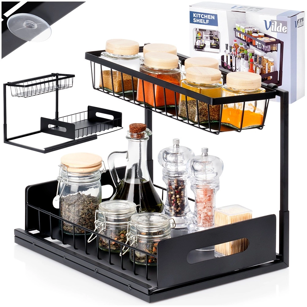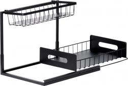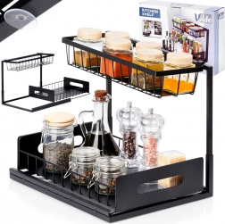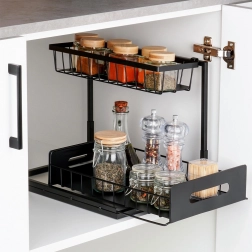 Praktická dvouúrovňová kuchyňská polička s výsuvnou dolní zásuvkou z pevného kovu v černé barvě udrží koření, skleničky a drobné kuchyňské doplňky přehledně na jednom místě. Výsuvná spodní police usnadňuje přístup, stabilní konstrukce zajišťuje odolnost a postranní úchyty pohodlné přenášení. Vhodná do skříněk, pod dřez i na kuchyňskou linku.
