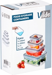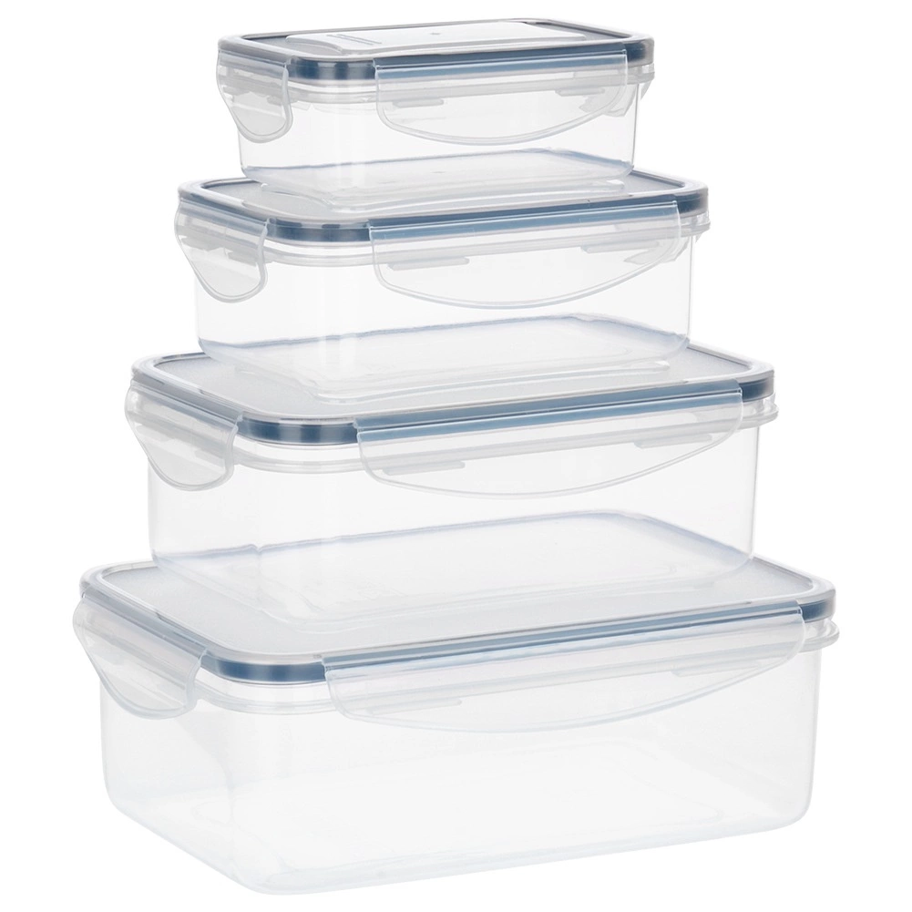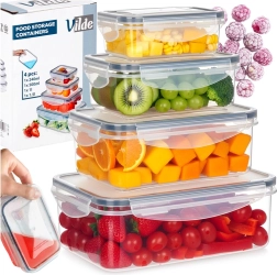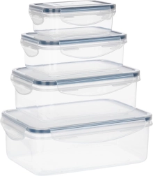 Praktická sada čtyř průhledných dóz s víky a silikonovým těsněním udrží vaše jídlo déle čerstvé a bezpečně uložené. Různé velikosti pro skladování i meal prep, vzduchotěsné uzavření díky čtyřem klipům, bez BPA a vhodné do myčky, mikrovlnky (bez víka) i mrazáku.