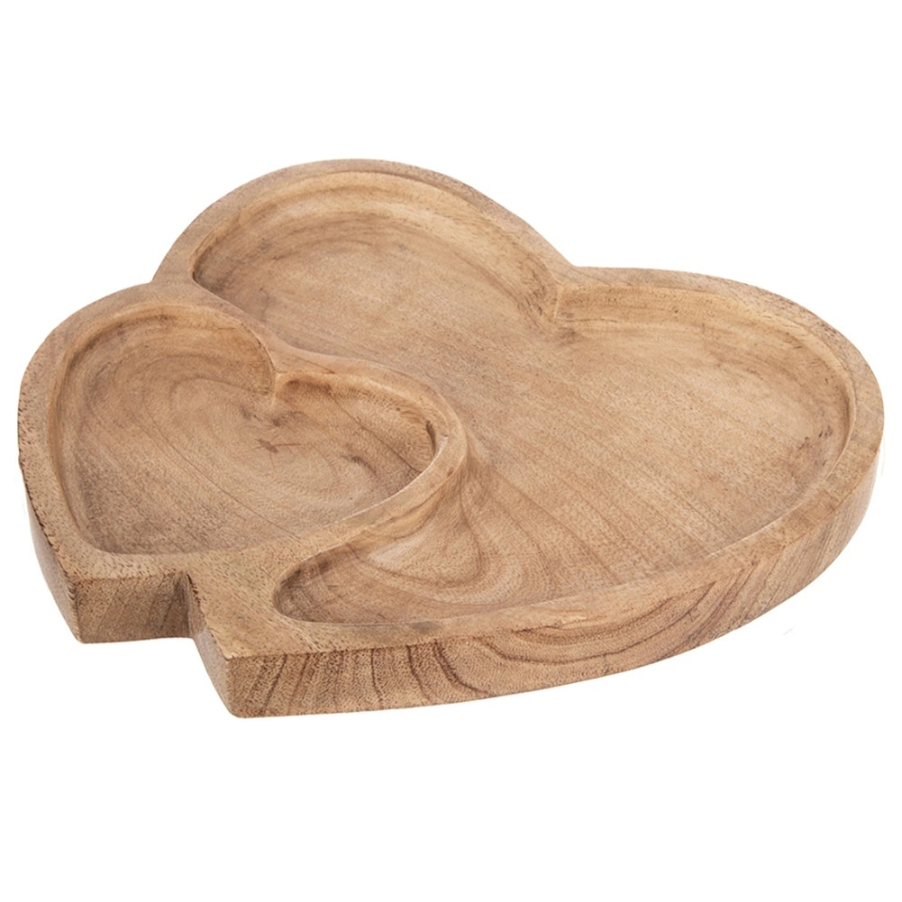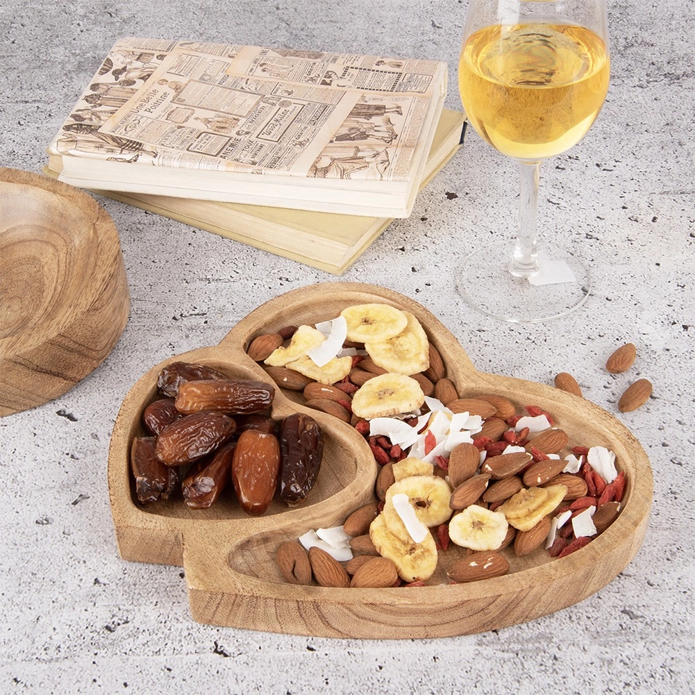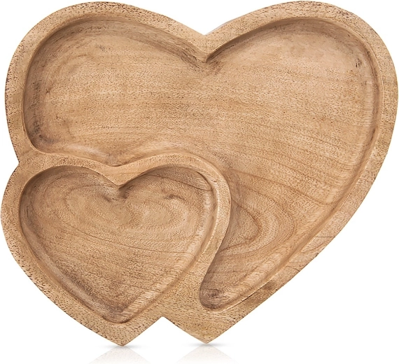 Tento servírovací tác z odolného mangového dřeva vyniká romantickým tvarem dvojitého srdce a praktickým členěním na dvě zóny. Hodí se pro každodenní servírování i slavnostní příležitosti – od ořechů a sušeného ovoce až po cukrovinky a sušenky. Díky přírodní kresbě dřeva zapadne do rustikálních, boho i skandinávských interiérů.