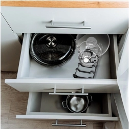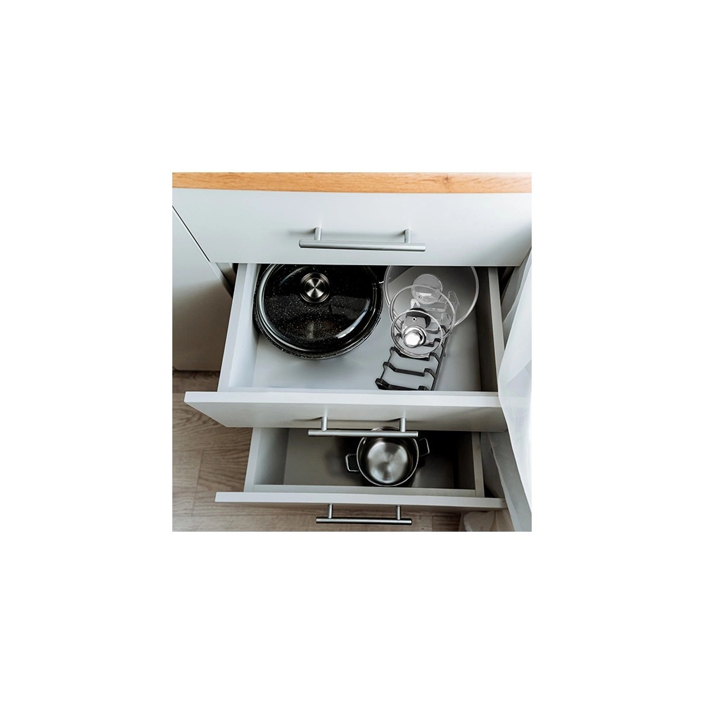 Oddělené drážky udrží pokličky a talíře stabilně ve svislé poloze, takže máte vše ihned po ruce a bez zbytečného chaosu.