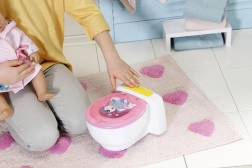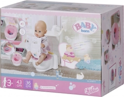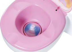 BABY born už chodí na záchod! Jakmile se posadí na svůj bílý trůn s růžovým sedátkem, uslyšíš zvuky čůrání, potlesku a veselého smíchu. BABY born se ale umí i vykakat. V tom případě se v míse objeví barevné třpytivé kakání. Rychle, je čas spláchnout! Když stiskneš splachovací tlačítko, kakání zmizí a uslyšíš zvuky spláchnutí.