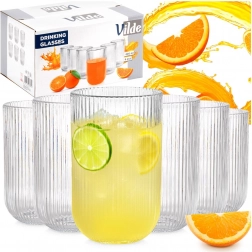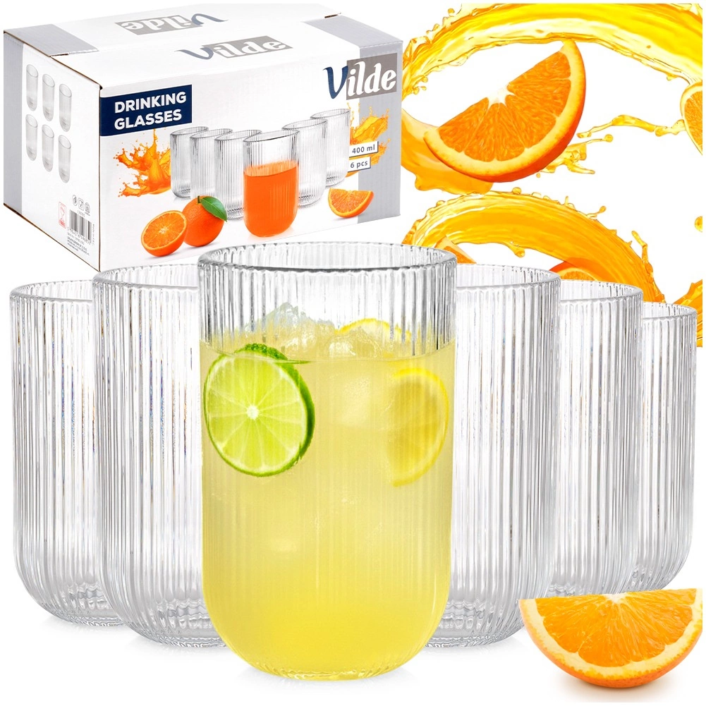 Elegantní sada 6 žebrovaných sklenic o objemu 400 ml pro vodu, limonády, džusy i koktejly. Vyrobeny z kvalitního, silného čirého skla, skvěle padnou do ruky a stylově zvýrazní obsah. Vhodné do myčky a ideální pro každodenní použití doma, v restauraci i baru.