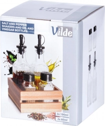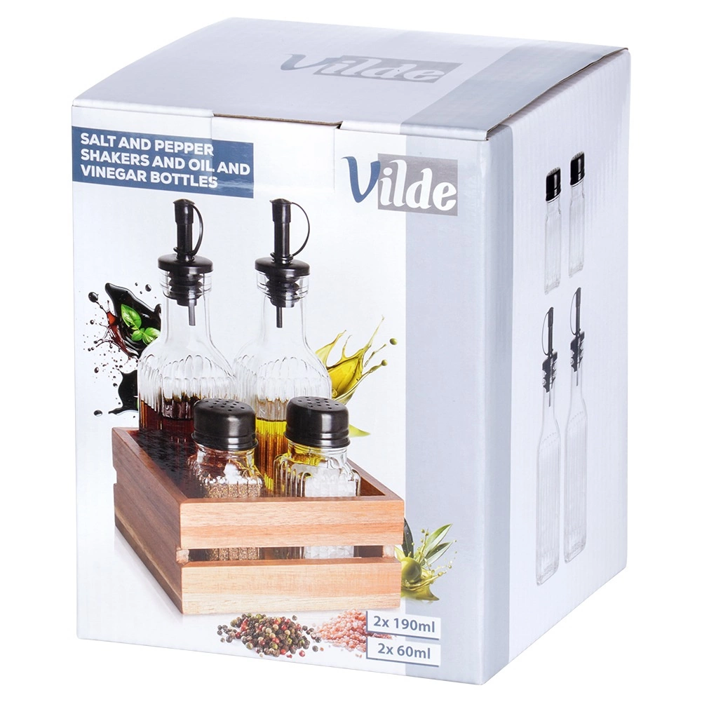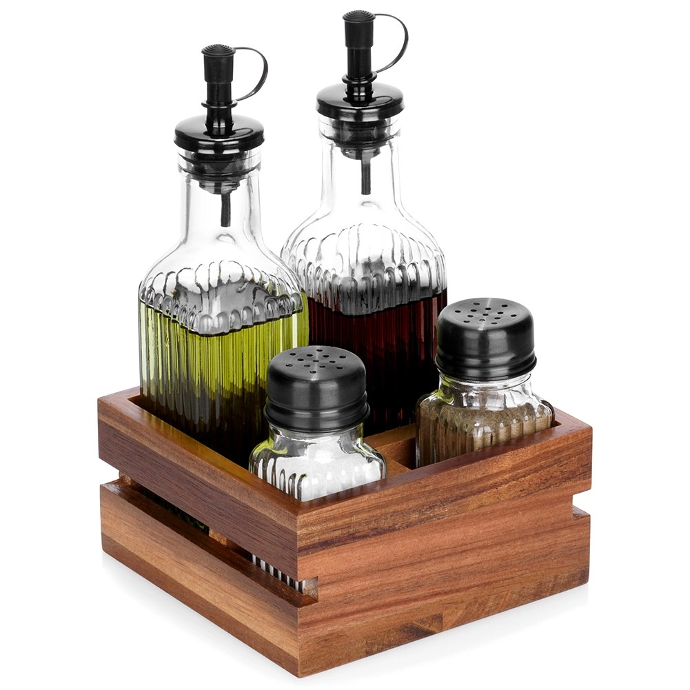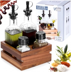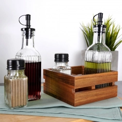 Tato stylová sada kombinuje funkčnost a estetiku: dvě láhve na olej a ocet s uzavíratelnými dávkovači zajistí čisté a rovnoměrné dochucování, solnička a pepřenka nabídnou přesné dávkování bez zbytečného rozsypání. Vše je uloženo v pevném stojanu z akáciového dřeva, takže máte dochucovadla vždy po ruce a úhledně uspořádaná na lince či jídelním stole.
