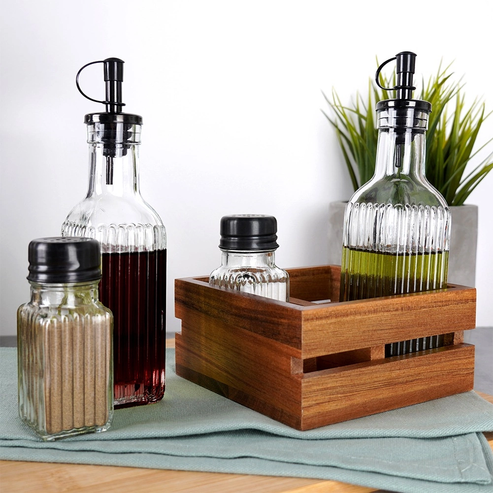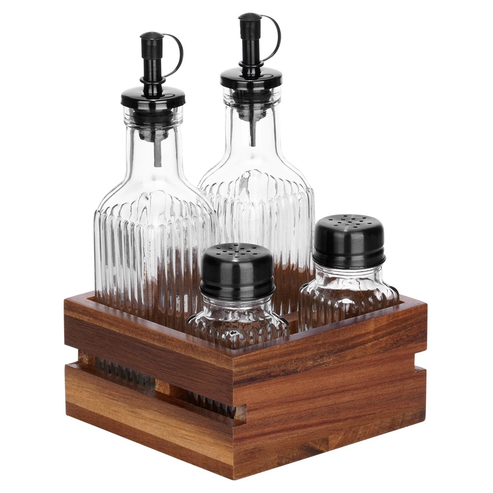 Ryhované sklo zvyšuje odolnost a jistotu úchopu, akáciový stojan udržuje všechny čtyři nádoby přehledně na jednom místě a zajišťuje snadné přenášení.