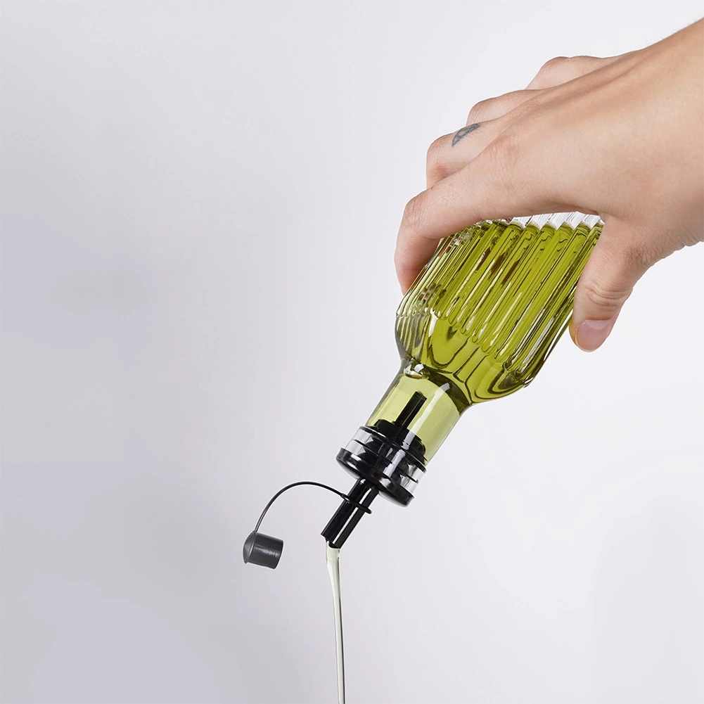 Láhve na olej a ocet mají úzké nalévací nástavce se zátkami, které zpomalují průtok, zabraňují kapkám a usnadňují rovnoměrné rozprostření po jídle.