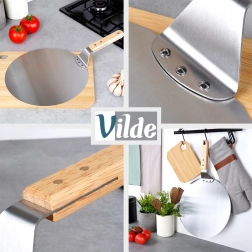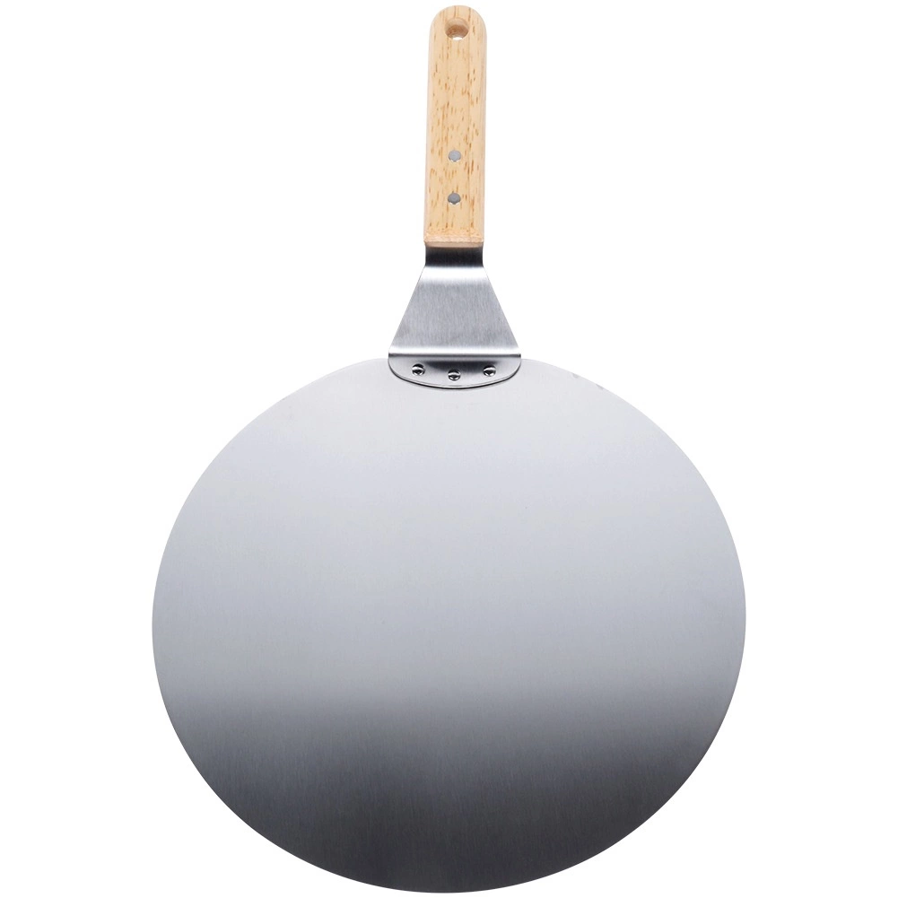 Praktická kulatá lopatka na pizzu z matné nerezové oceli s ergonomickou dřevěnou rukojetí pro bezpečné přenášení, vytahování a servírování. Díky pevnému zpracování, odolnosti vůči vysoké teplotě a speciálně tvarované čepeli se skvěle hodí do kuchyně i gastronomických provozů. Univerzální použití pro pizzu, chléb i jiné pečivo z trouby, grilu či pizza pecí.