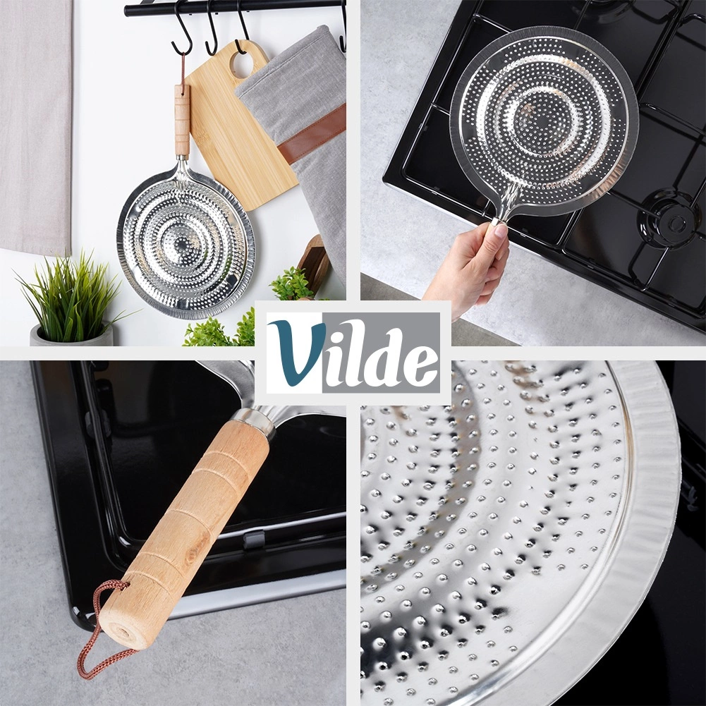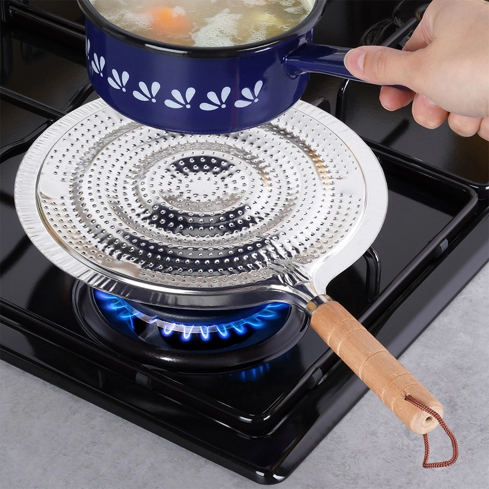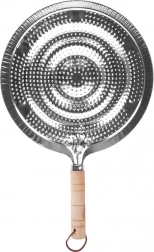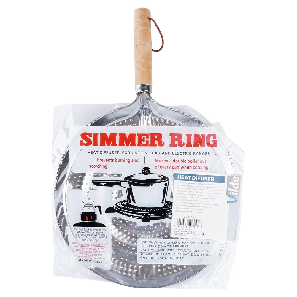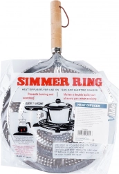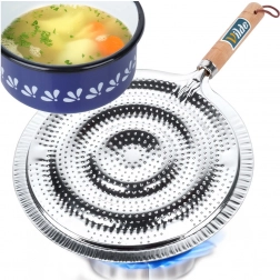 Praktický kovový rozptylovač plamene pro plynové sporáky s průměrem 21 cm a celkovou délkou 32,5 cm. Zajišťuje rovnoměrné rozvádění tepla, chrání skleněné a keramické nádobí před přímým plamenem a prasknutím a má pohodlnou dřevěnou rukojeť s poutkem na zavěšení.