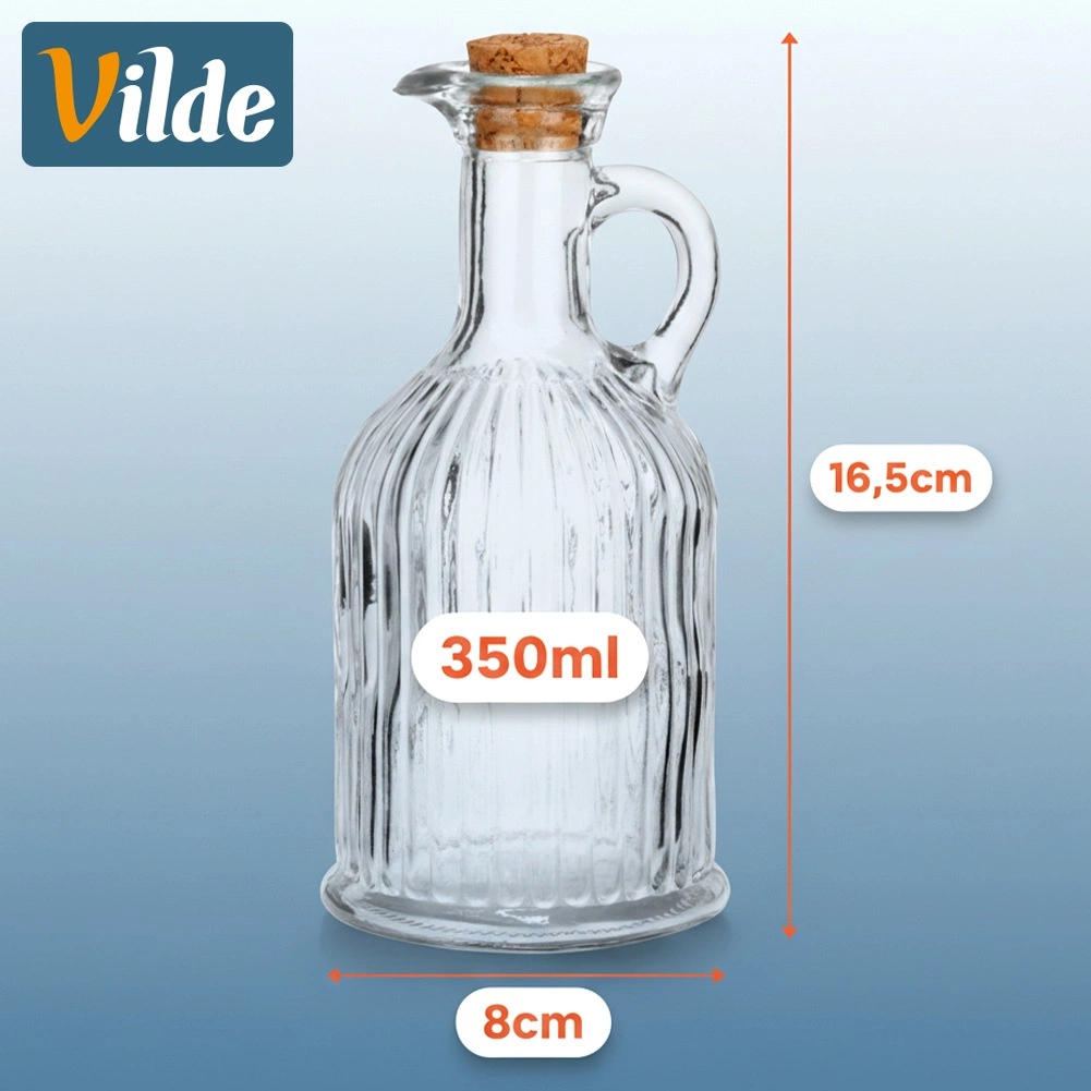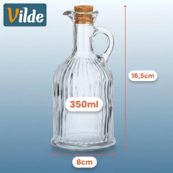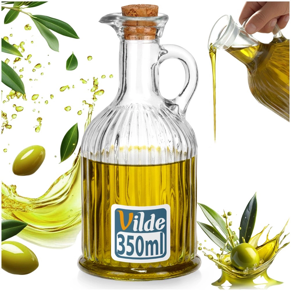 Elegantní skleněná láhev o objemu 350 ml pro pohodlné servírování olivového oleje nebo octa. Má ryhované sklo pro jistý úchop, praktické ouško pro snadné nalévání a přírodní korkový uzávěr, který chrání obsah a udržuje čerstvost. Skvěle se hodí do kuchyně i na jídelní stůl, doma i v gastronomii.