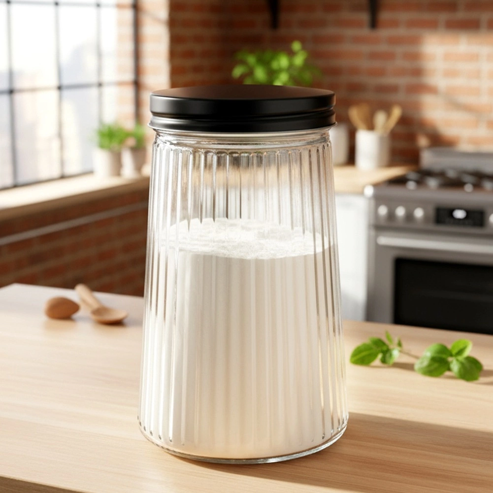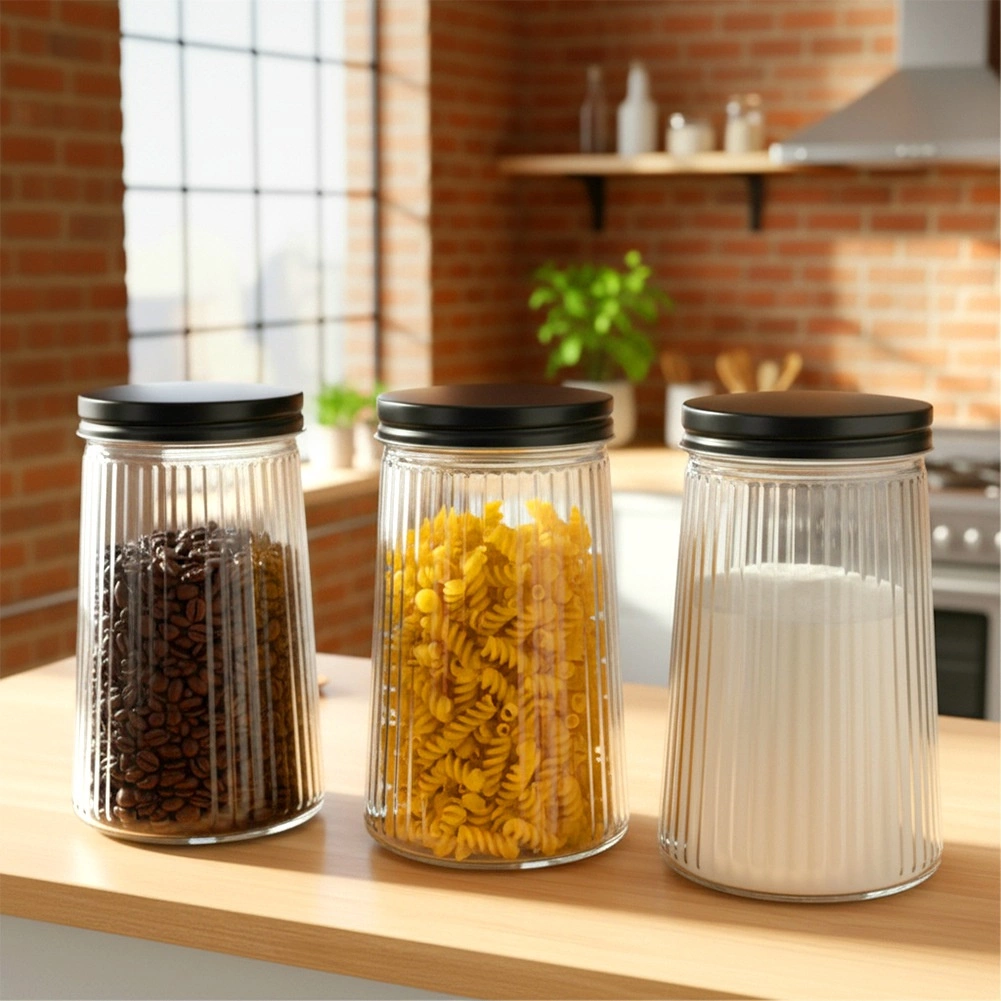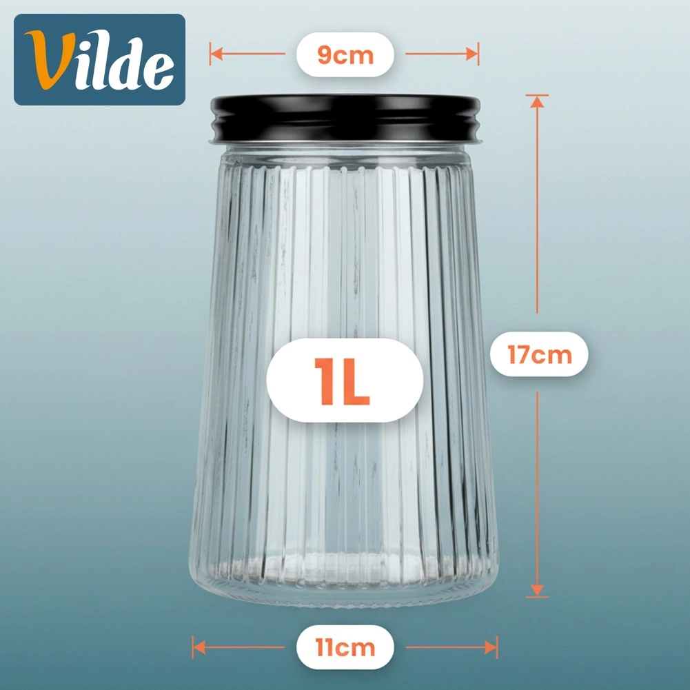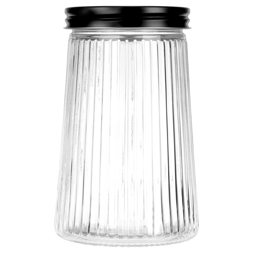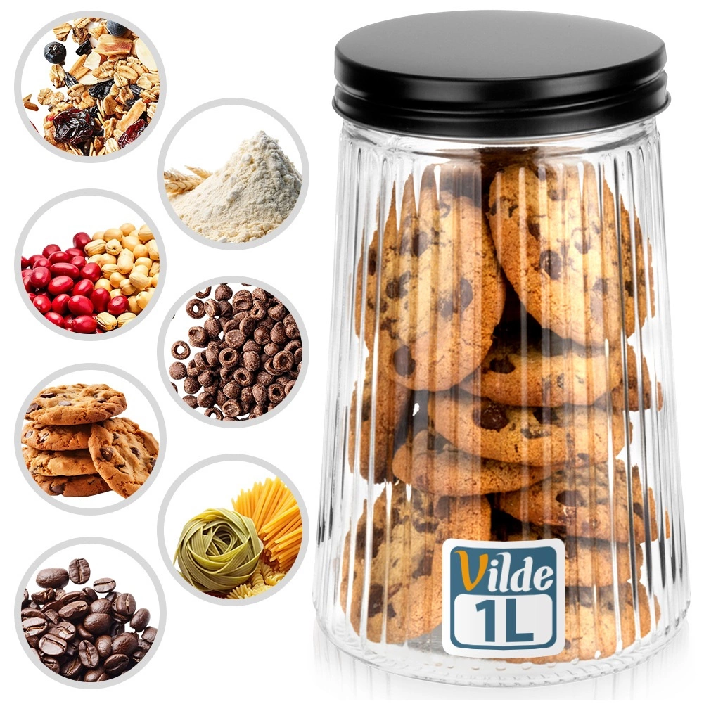Praktická skleněná dóza o objemu 1 litr s šroubovacím kovovým víčkem udrží vaše potraviny déle čerstvé a krásně uspořádané. Vyrobena z odolného borosilikátového skla s elegantním ryhovaným designem, umožňuje snadnou kontrolu obsahu a množství. Ideální na kávu, těstoviny, cukr, ořechy či další sypké suroviny.