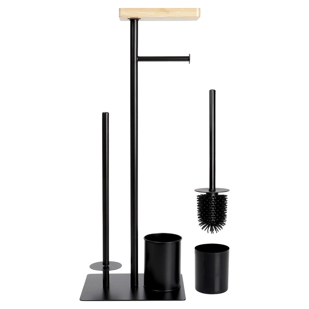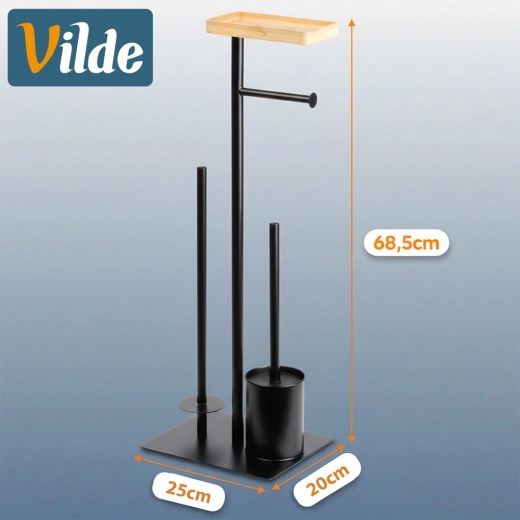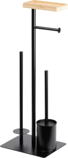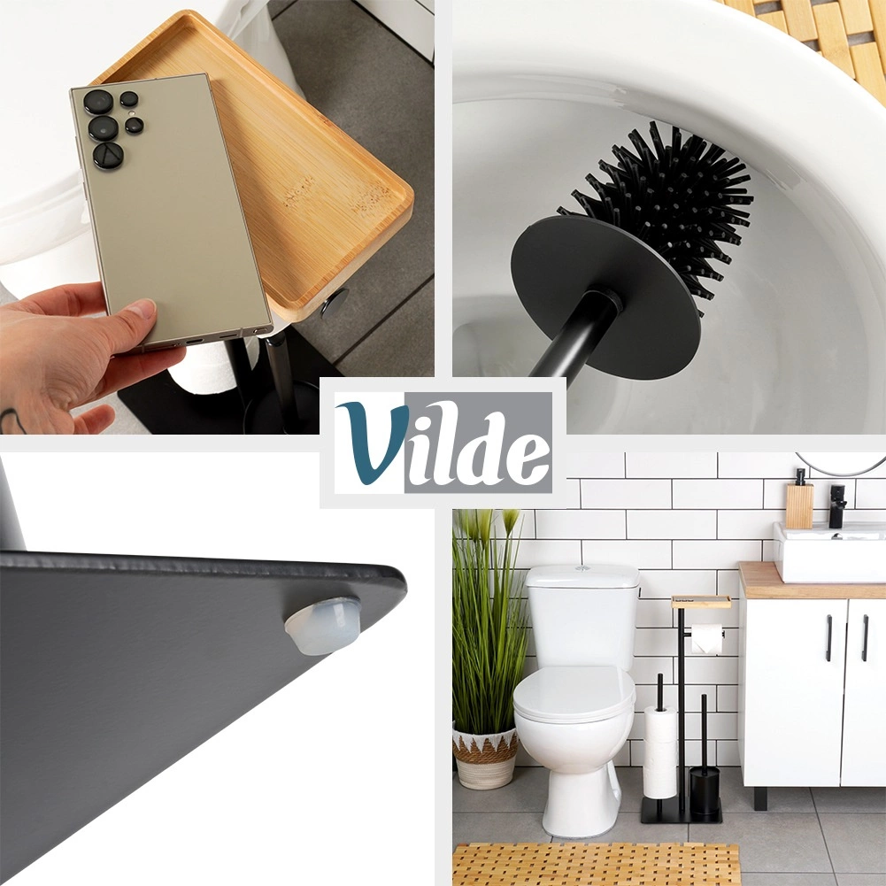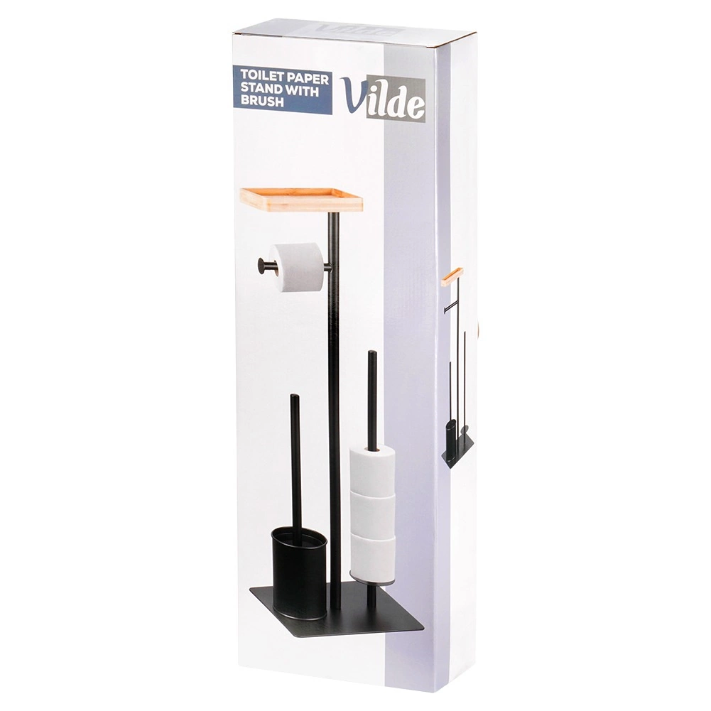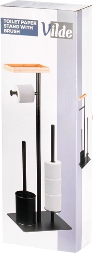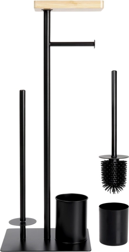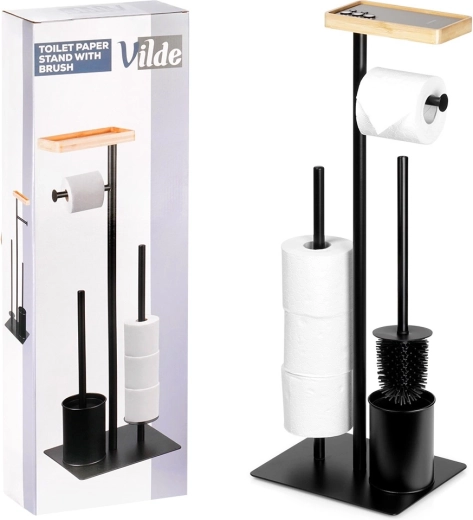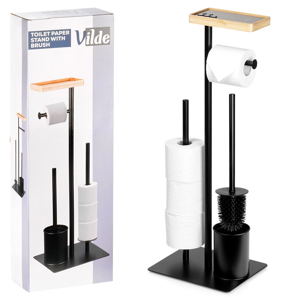 Praktický 2v1 pomocník do koupelny: stojan na toaletní papír se štětkou v elegantní černé barvě. Nabízí držák na aktuální roli, prostor pro 3 náhradní rolky, WC štětku se silikonovými štětinami a bambusovou poličku na telefon. Kompaktní rozměry 25 × 20 × 68,5 cm a stabilní kovová konstrukce zaručují pořádek i pohodlí v každé koupelně.