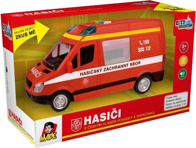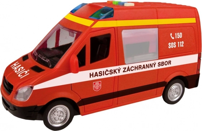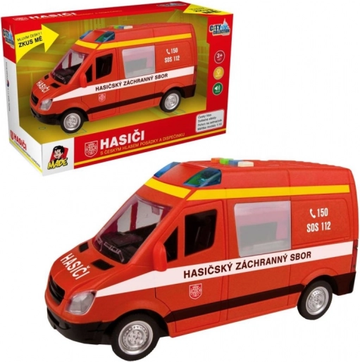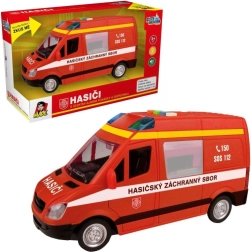 Tato hasičská dodávka potěší všechny malé záchranáře realistickým provedením a funkcemi. Po stisknutí tlačítek uslyšíte český hlas dispečinku a posádky a uvidíte blikající maják. Díky setrvačníkovému pohonu auto jednoduše postrčíte a rozjede se vpřed.